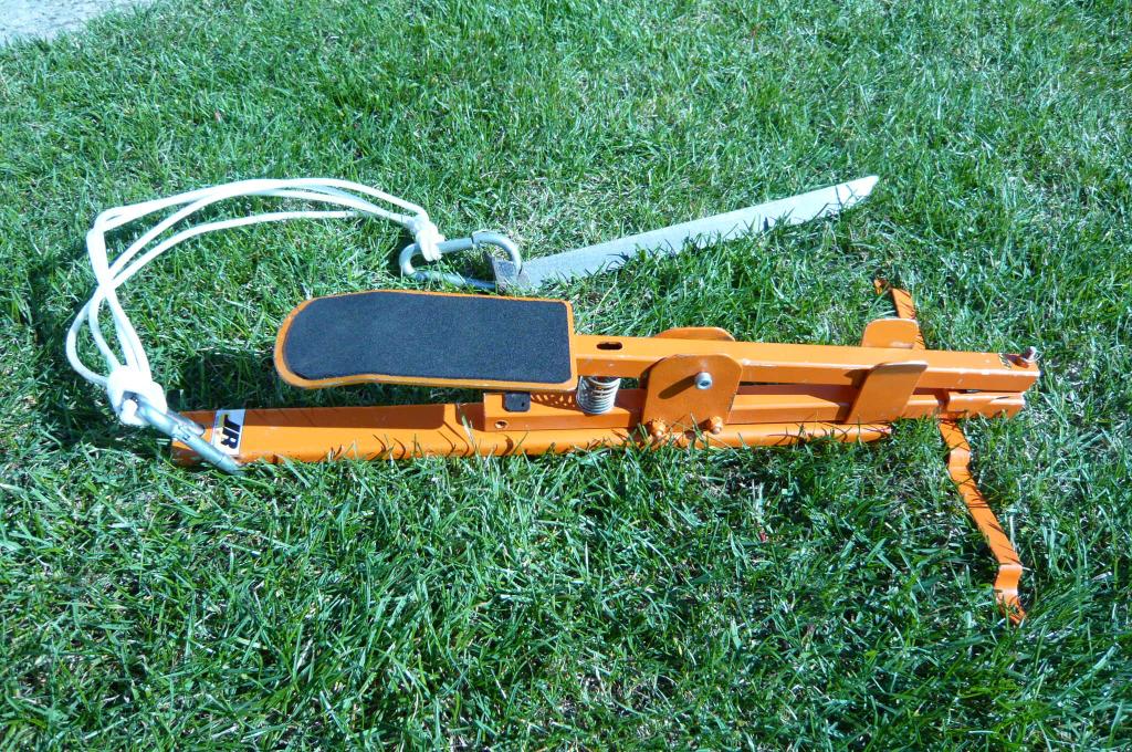 První nápad by byl: Šikmé prkno, guma jako do praku, natáhnout, zachytit za nějakou zarážku, a nohou (sešlápnutím nějakého spušťadla) by se guma uvolnila.