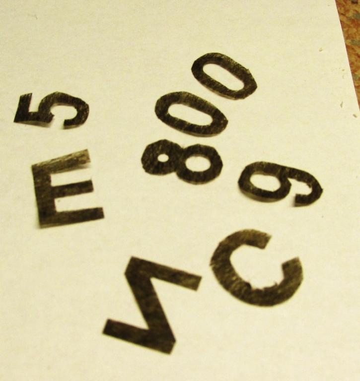 Snažím se "popsat" svoje házedla a vystřelovadla licencí pro případnou (náhodnou) účast na soutěži. Podle pravidel, by měli mít minimálně 15mm na výšku. Na lehké modely nechci lepit žádné samolepky a nechci ani popisovat rukou, fixem nebo popisovačem. Zvolil jsem řezání čísel a písmen z jinak nabarveného potahového papíru, než je potah.