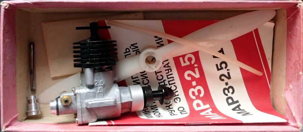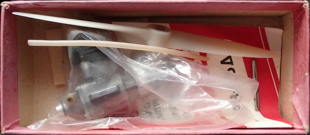 No a teraz sľúbené fotky motora MARZ-2,5D v originálnom balení. Je tam vrtuľa 200/100, tyčka na zaťahovanie kužeľa, montážne skrutky M3 s matičkami (v zabalené v papieri, nevidno ich) a náhradný obstrekový difuzér s väčším priemerom 3,5mm (na motore je 3mm) a rozsiahly návod (ak by bol záujem môžem celý oskenovať a spraviť PDF).