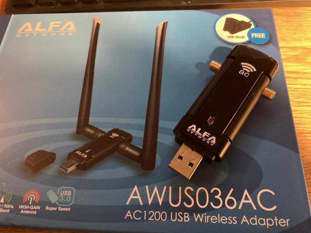 Takže jsem koupil pár skvělých USB kartiček od Rolls Royce mezi výrobci, ALFA AWUS036AC, jsou to maličké kartičky velikosti USB flashky, mají dva anténní konektory, a umí jak 2,4 tak 5,8 GHz.