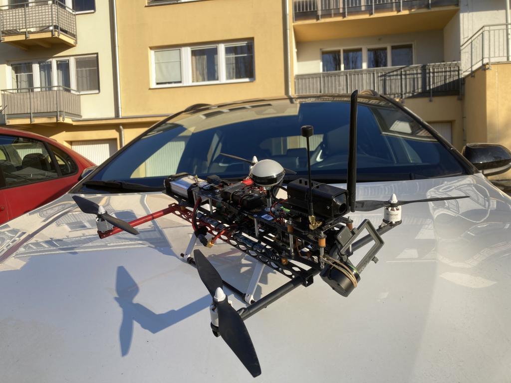 Po vyzkoušení jsem na 3D tiskačce vytisknul lehké pouzdro, do které se vešly RPI Zero2 a kamerka. K tomu jsem dal USB kartičku AWUS036AC a bylo hotovo, zde už na kopteře: