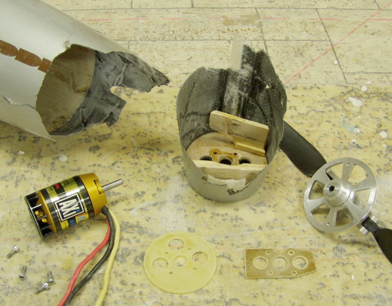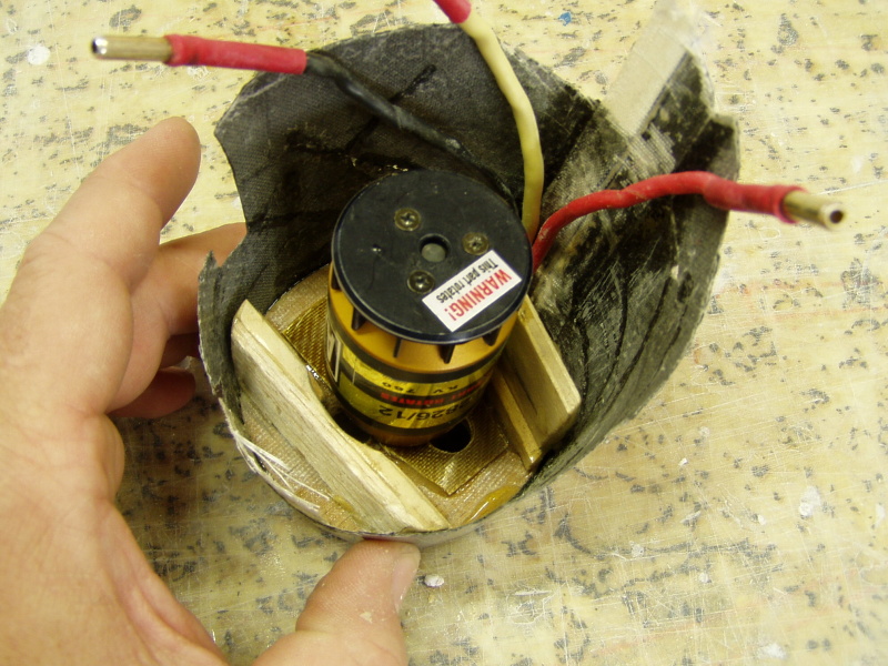 Zkušebně jsem osadil motor .Pozn. ta spodní balsová příčka slouží k podsunutí a fixaci desky, na které jsou upevněné pohonné akumulátory .