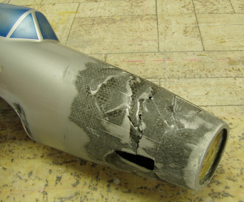 Chvíli jsem si hrál při pasování ulomené špičky k zadní části trupu . Díly jsem postupně zbodoval vteřinákem. Když už to drželo pohromadě, všechny spáry jsem ještě jednou prolil řídkým vteřinákem a přebrousil nerovnosti.