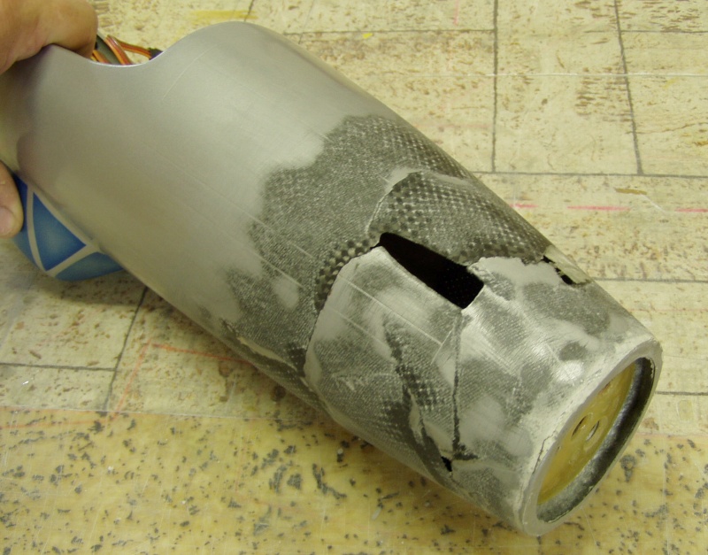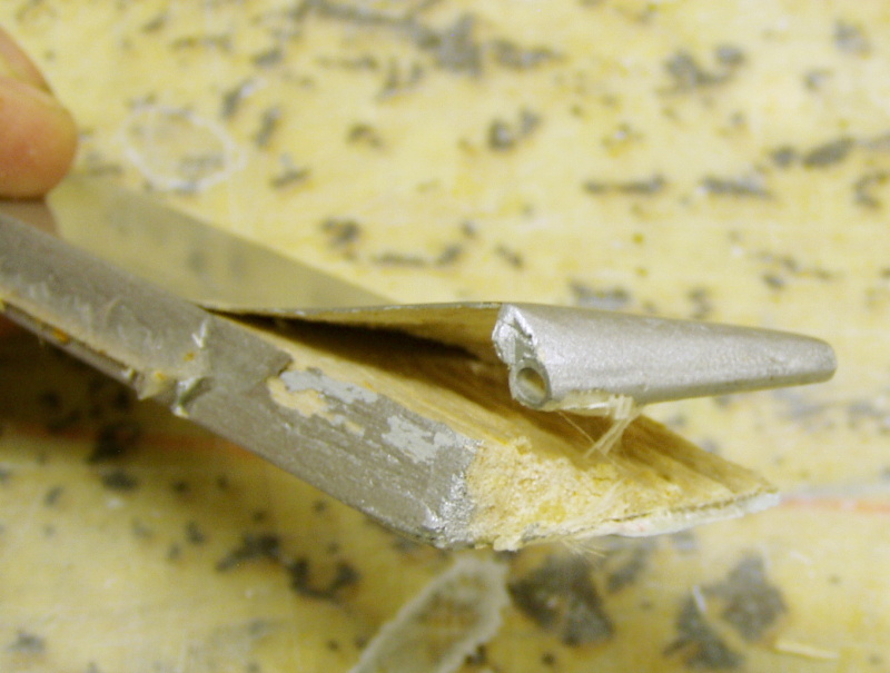 Odřezal jsem některé rozdcené části jádra i potahu , kus chybějící uhlíkové trubky nahradil bukovou kulatiou ( byla po ruce a pasovala do díry) ,spoj natřel Soudalem a díly sesunul provizorně k sobě.