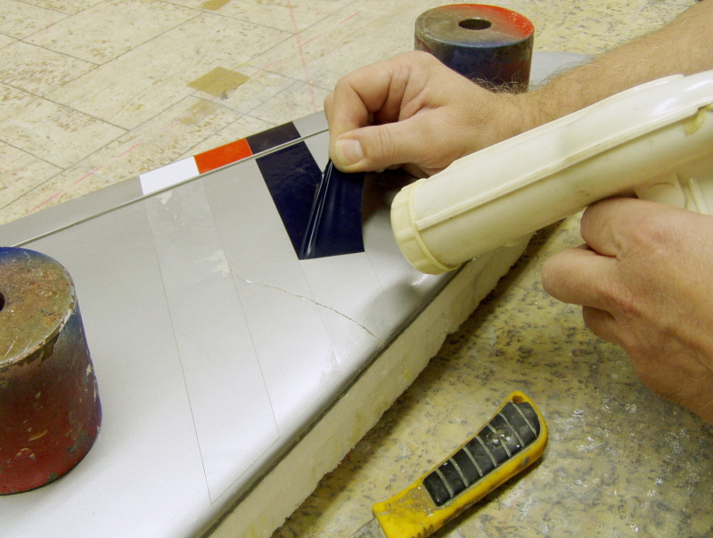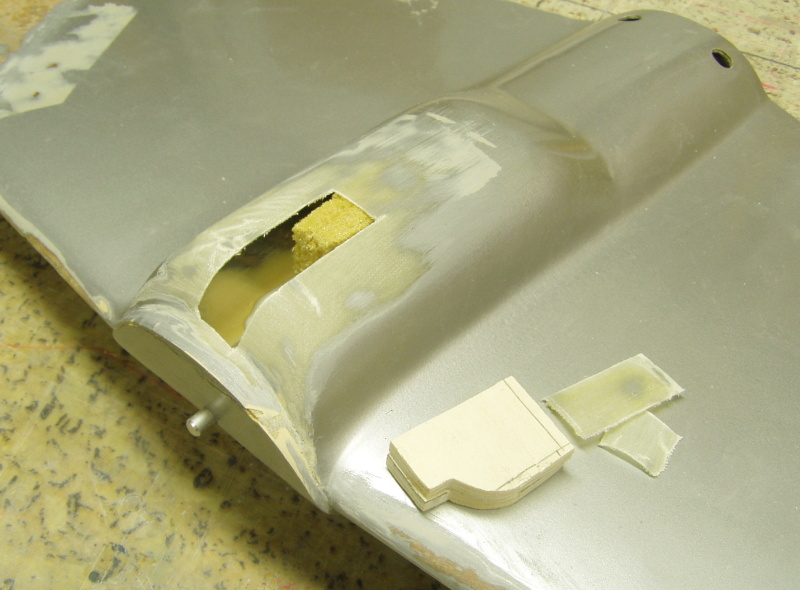 Pozn. rozlepený sendvič na boku trupu ( v úseku za vypínačem) jsem před samotnou laminací nejdříve hustě propíchal špendlíkem a zalil řídkým vteřinovým lepidlem (lepidlo navzílná mezi potahy a sendvičové jádro a vzájemně je mezi sebou opět propojí) . Po zpolymerizování lepidla a lehkém obroušení povrchu , jsem poškozené místo zesílil přelaminováním třemi , rozměrově odstupňovanými pásy skelné tkaniny cca 30g/m2.