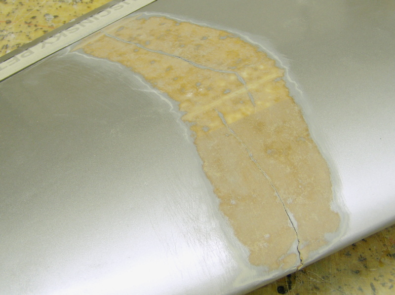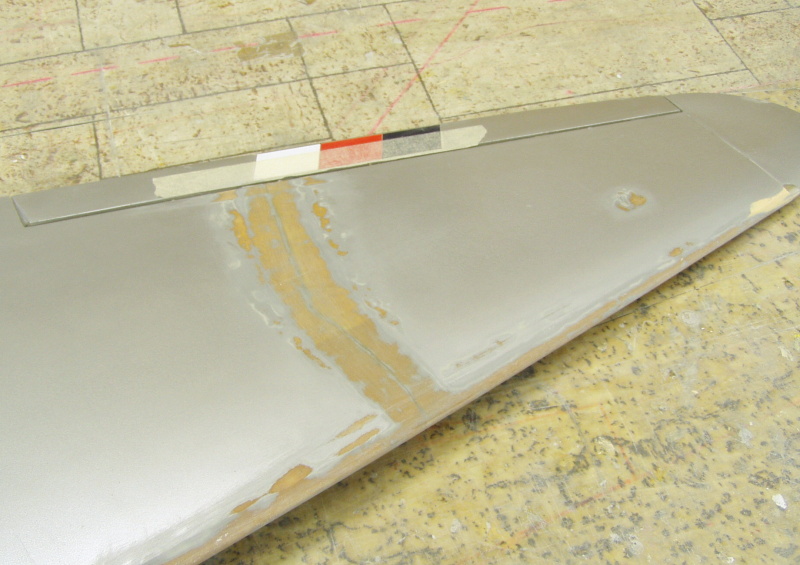 Odbrousil jsem barvu z okolí všech trhlin v potahu a současně brusným papírem protáhl i náběžnou hranu ,čímž jsem poškozená místa na křídle kompletně připravil k laminaci .