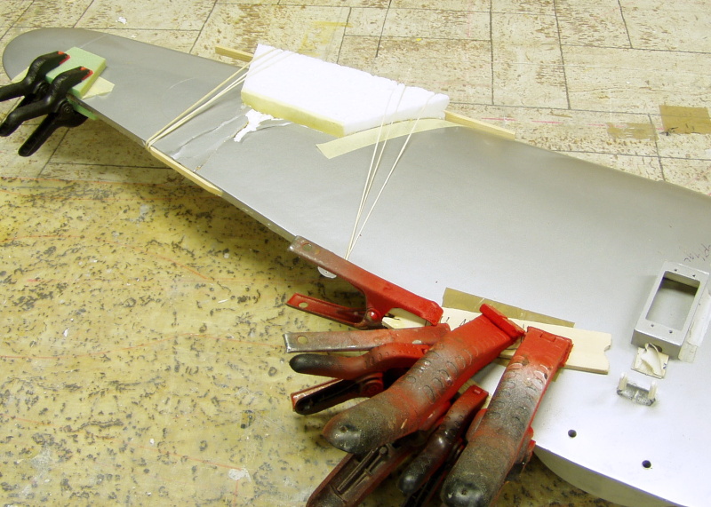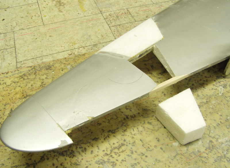 Chvíli jsem koukal ,váhal ( línost je pěknej prevít), ale nakonec jsem odstranil i lehce zmuchlanou část za nosníkem a nahradil novou výplní. V místě odtokové hrany jsem dolícoval hranolek tvrdé balsy.