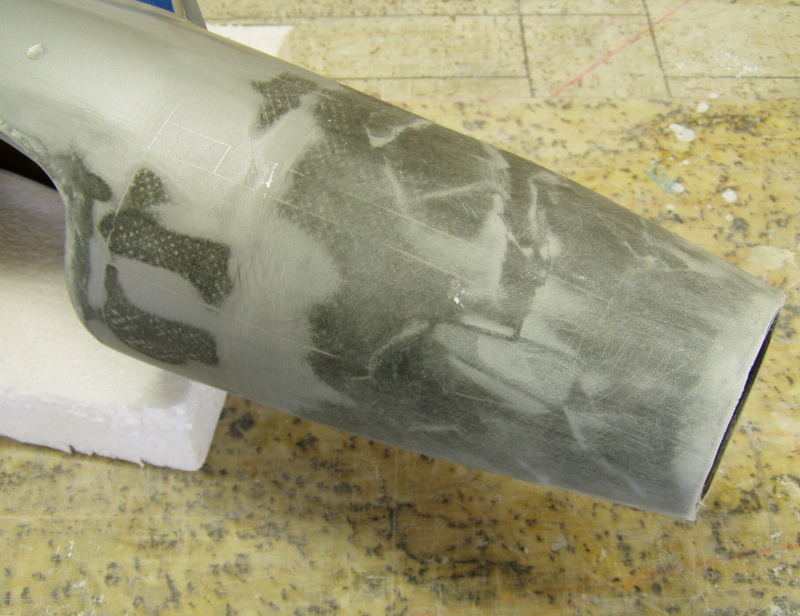 Opravené místo přeplátuju kouskem uhlíkové tkaniny ,kterou zvenčí zakryju kouskem uhlíku (140g/m2) a povrchově zarovnám třemi proužky skelné tkaniny 50g/m2.