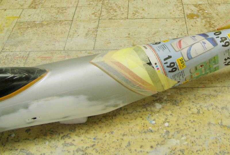 Zamaskoval jsem kabinu a zadní nepoškozenou část trupu , původní barvu přebrousil brusným rounem ( naruší zoxidovanou vrstvu na povrchu barvy) a šup do lakovny.