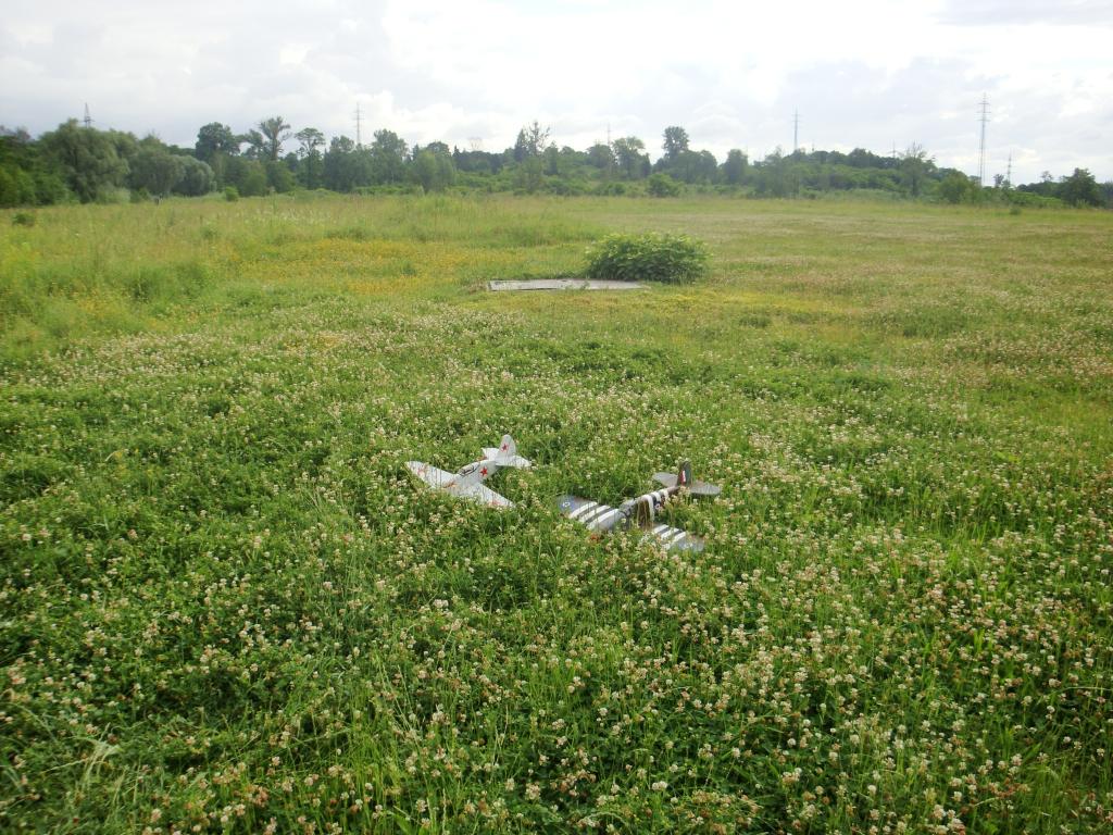 Dneska jsem byl prubnout Pinnacla v novém hávu, nově zpevněný Modelspanem. Jetel už je tak vysoký,že jsem musel sundat podvozek a letadlo házet jako kombata.Díky celé konstrukci zpevněné papírem,nebyly na náběžce žádné otlaky stébel.Bohužel můj kombat Hellcat přistávající běžně na břicho,už pár zařízlých stébel měl