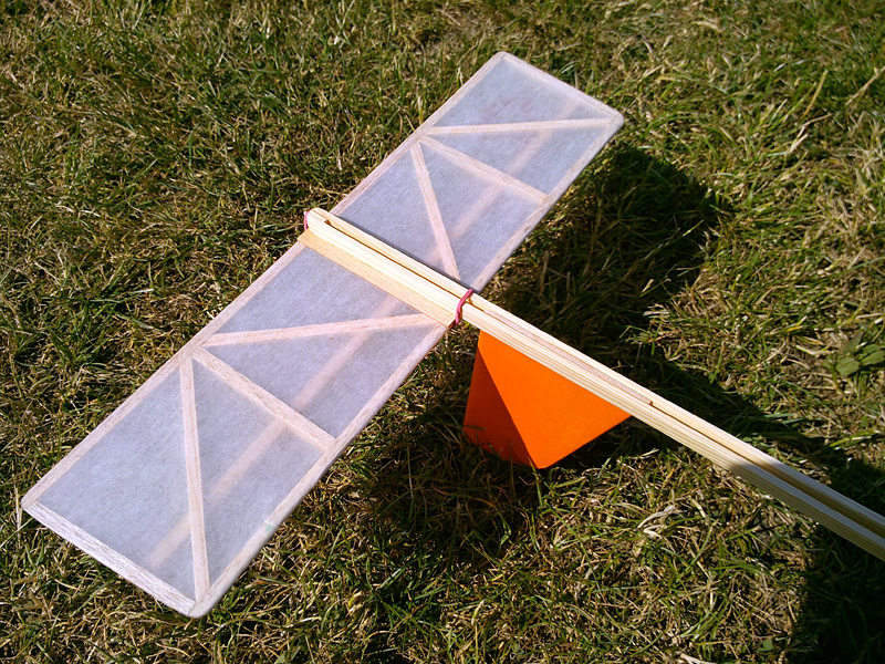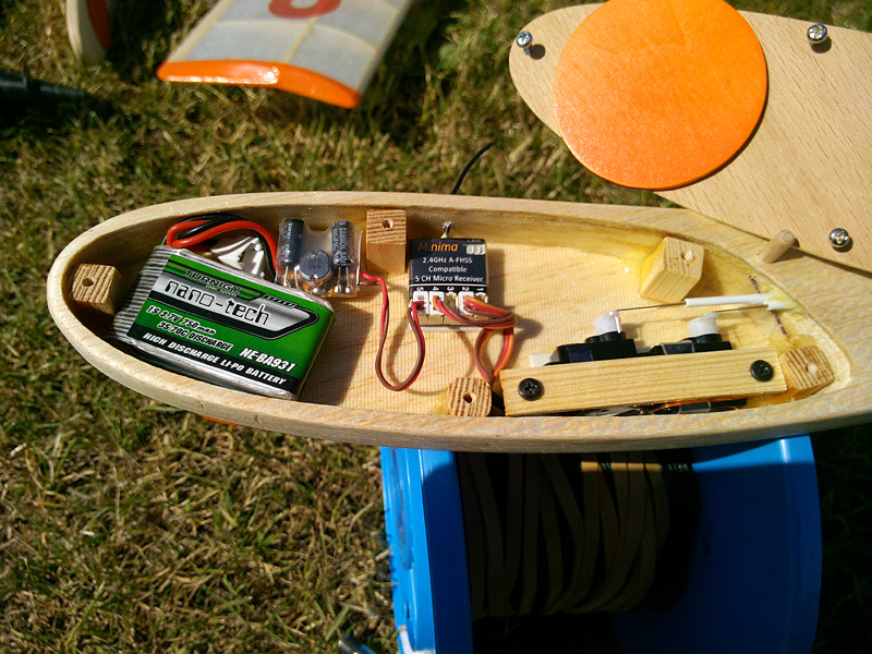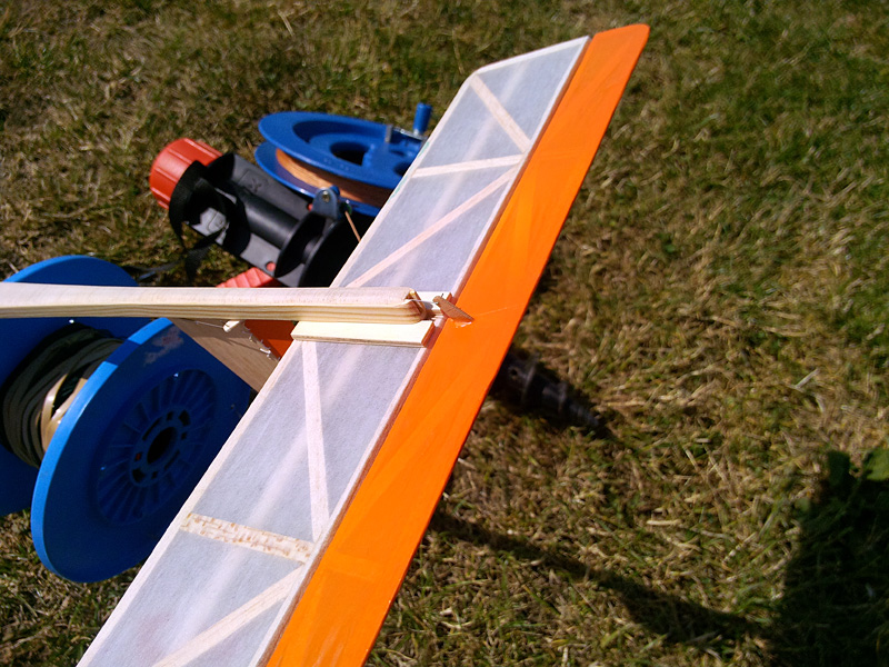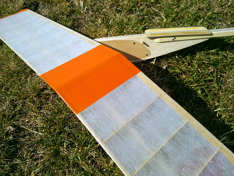 V težišti, do lože křídla jsem přidal dva olověné pájecí dráty, abych to měl jasně přes 150 g. Závodit s tím nebudu, to by nešlo, ale pro vnitřní pocit a odpozorování letových vlastností to bylo potřeba.