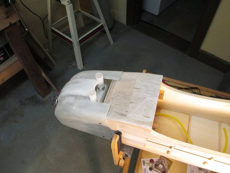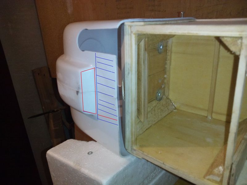 Potřeboval bych poradit od zkušených. Jde mi o kryt motoru, jak doladit chlazení motoru. Dohledal jsem, že by poměr přívodu a odvodu vzduchu měl být 1:3. Výfuk motoru je na boku a jelikož nebyl prostor mezi krytem a výfukem, musel jsem udělat otvor. Ovšem výfuk víceméně tento otvor zaplní, jsou jen škvíry okolo. A mě jde o to, jak dodělat to chlazení, jestli to udělat podle červené čáry nebo modré, jak jsem to znázornil na přiložených fotografiích. Přikládám ještě foto, kde je to vyřešené, ale tam je výfuk mezi přepážkou a motorem.