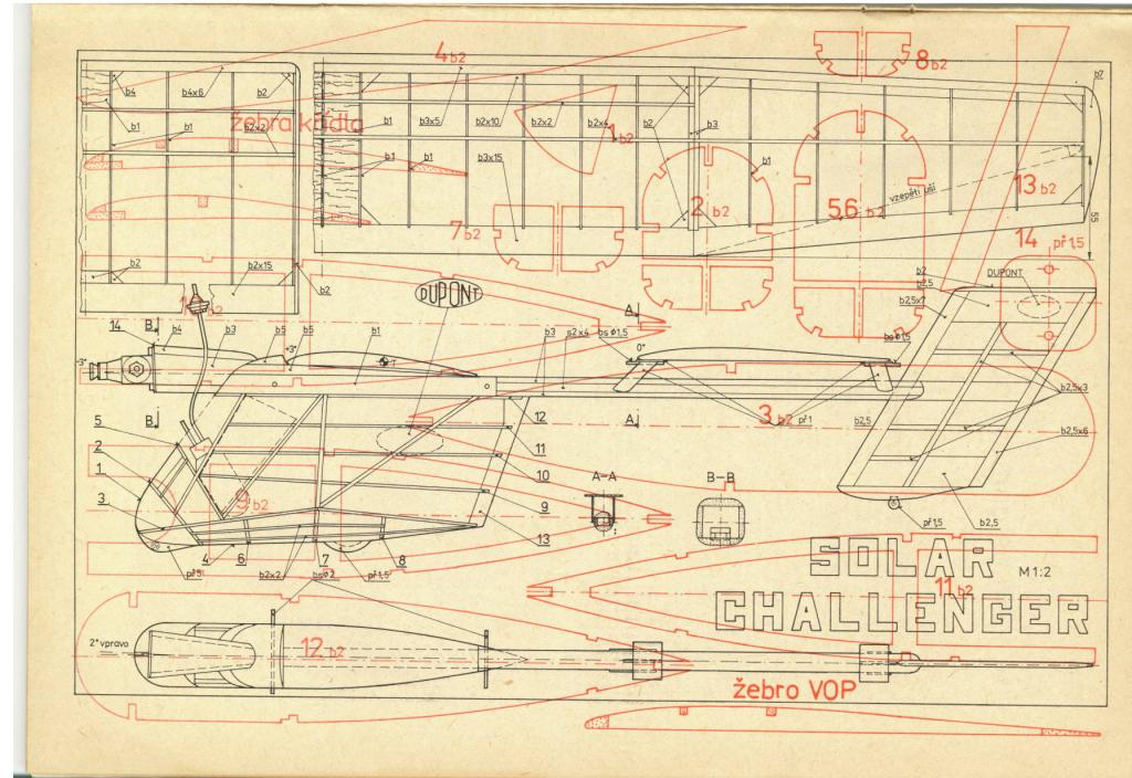 Potrebujem poradiť s koncepciou pomalého elektroletu. Zo starého plániku som si prekreslil do autoCADu sifoňáka solar challenger. Chcem ho zväčšiť a opatriť rádiom a nejakým strieďakom. Mal by to byť nejaký pomalolet do podvečerného oleja, takže malé otáčky vrtule a kľudný let. Pôvodne tam je nejaký riadne prehnutý profil. Aby to aj pomaly letelo, rozmýšľal som použiť profil z nejakého volňáska F1A, resp F1B. Rozpätie som uvažoval cca 1,6 až 2 metre, delené krídlo, s váhou by som sa chcel dostať na cca 400 gram bez batérie, konštrukcia balza, uhlíkové nosníky, poťah vlies, ovládané K, V, S, M.