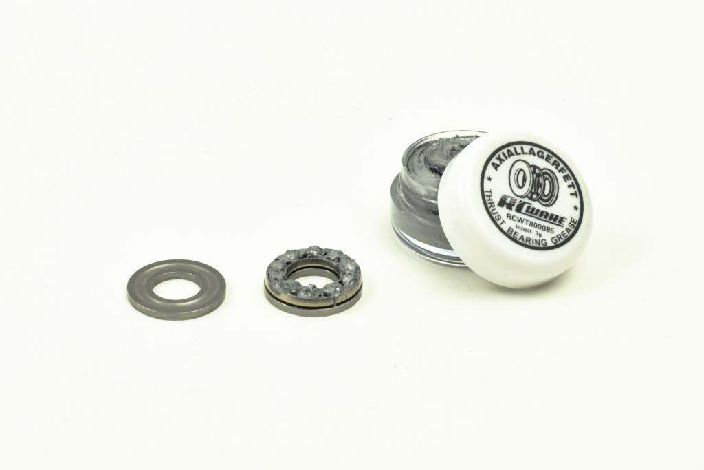Axiální ložiska je vhodné samozřejmě namazat. Narazil jsem na zajímavou vazelínu, která o sobě tvrdí, že je právě pro axiální ložiska určena. Další věcí je diskuse jak klec ložisek otočit. Celá léta jsem otevřenou stranu klece dával směrem k hlavní hřídeli a ač jsem osobně nikdy problém s klecí neměl, podlehl jsem argumentům a klece otočil otevřením směrem ven.