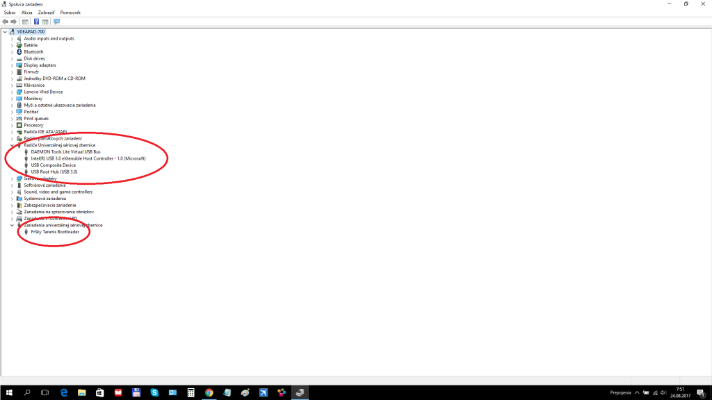 RCStudio píše:Nema tam byt bootloader ale dvakrat mass storage, zmen ovladace aby tam byl Frsky Taranis radio usb device a velkokapacitni zarizeni, ja tam mam 4 zarizeni