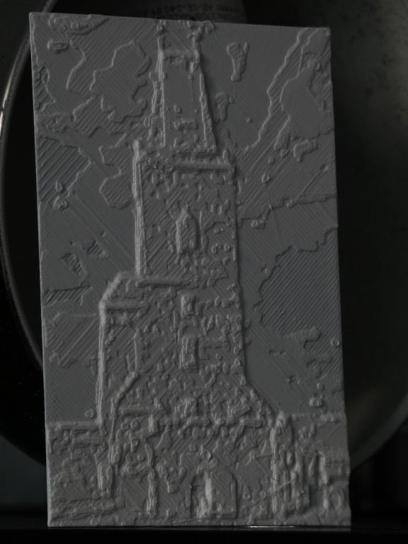 To vypadá tisknutý naplacato, mě se to neosvědčilo jako děsně neefektivní. Výrazně lepších výsledků dosahuju s tisknutím na výšku, v programu si zaškrtnu aby výtisk byl prohnutý (Outer Curve), lépe pak drží na podložce, zaškrtnu aby nejslabší tloušťka stěny byla 1mm a aby to udělalo rámeček okolo 5mm (pro celkové zpevnění). Taky je potřeba nastavit Positive image aby to nevytisklo negativ - to by se jeden po x hodinách tisku nemile divil. Ostatní parametry asi neměním. Ještě si v slicru dám několik mm tlustý brim, to už spíš jen pro klid duše aby se výtisk určitě neulomil. Tisknu to z bílého PLA vrstvou 0,20mm, 0% infill, 5 perimetrů - není to ale dogma. Výtisk rodinného fota asi 15x20cm švagrové k narozeninám zaznamenal obrovský úspěch, tisk trval asi 9 hodin, takže návrhy laiků na oslavě, ať to začnu tisknout hromadně, jsem zdvořile odmítal pod záminkou, že by to ztratilo punc výjimečnosti.