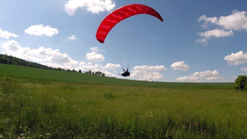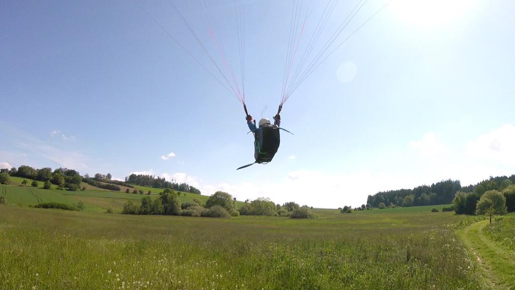 Funkci speedu jsem v podstatě nevyzkoušel, protože skoro nefoukalo a nebylo proti čemu prostupovat, při nastavení naplno se jen zvýšil úhel klesání. Taky se mi povedlo ke konci prvního letu udělat nechtěně něco jako fullstall (naštěstí ve výšce) a následně kyvadlo při návratu do normálního stavu, výsledkem bylo trochu zamotaný ucho a s tím jsem i přistál.