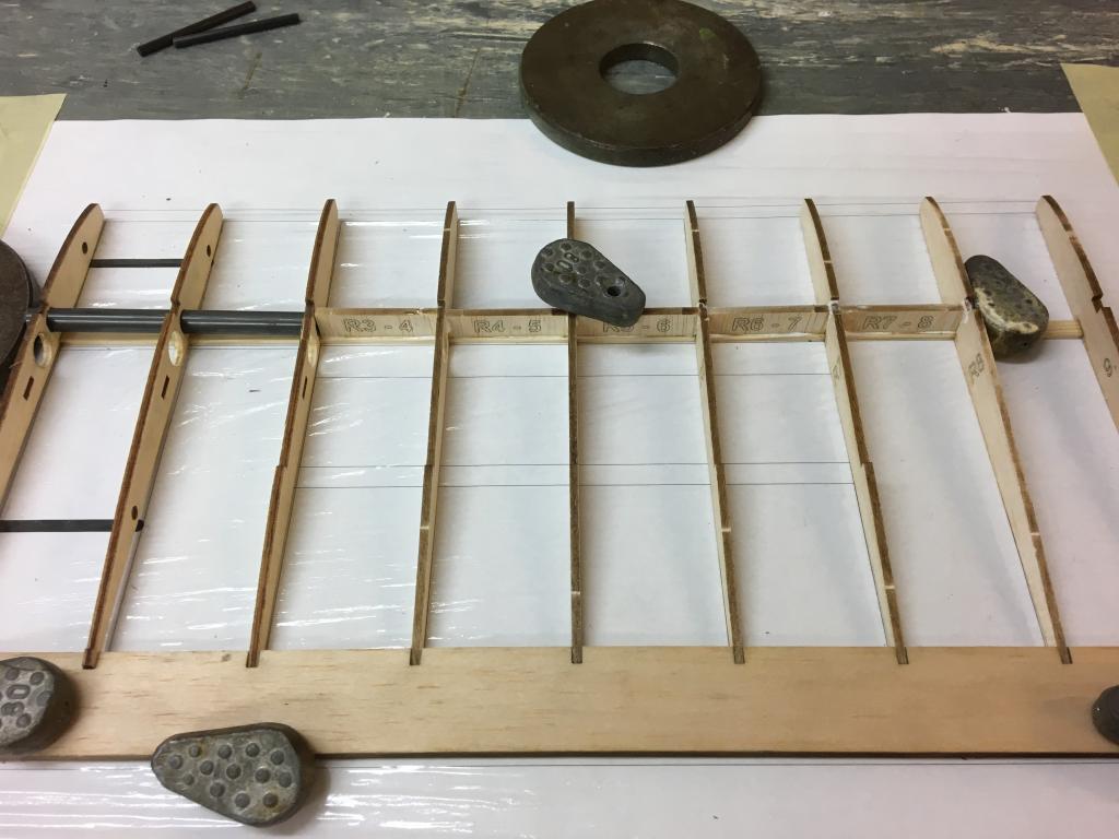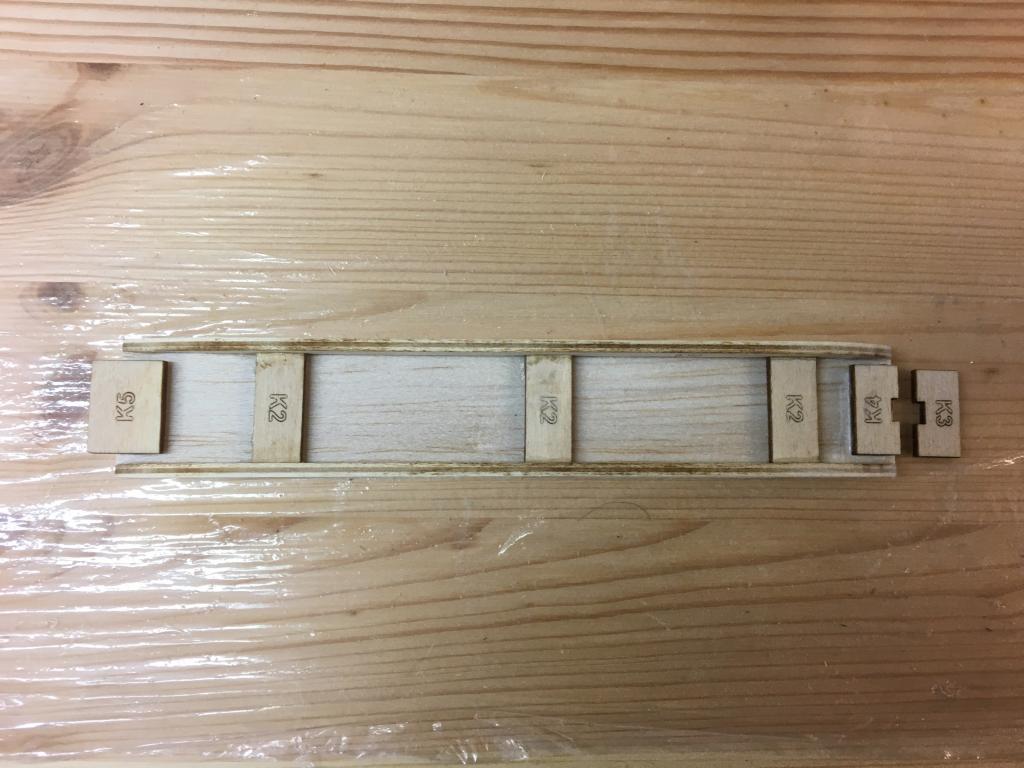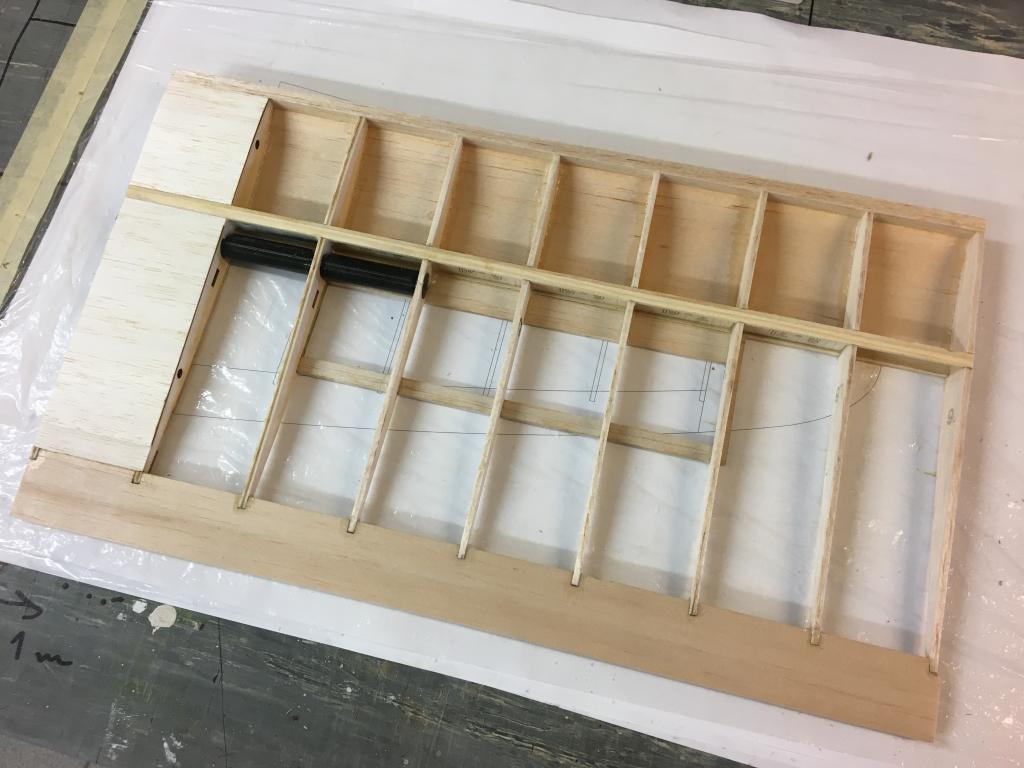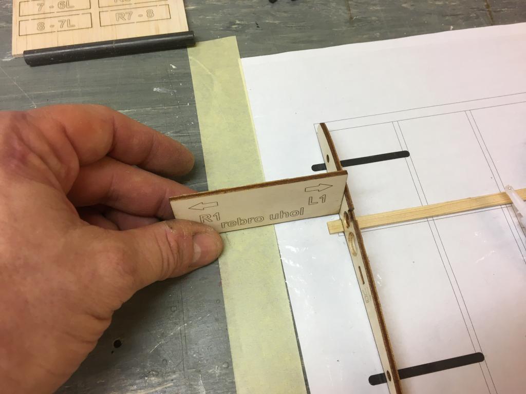 Krídlo je robené klasicky na centroplán dva nosníky 5x2mm + stojiny, D box som navrhol len z vrchnej časti a poťah z hornej a dolnej časti prvé dve rebrá. Stavbu začneme prvým rebrom ku ktorému použijeme prípravok na uhol prvého a posledného rebra kôly vzopätiu /obr.2/. Potom postupne vlepíme stojiny /obr. 3/. Stojiny dávame od 3 po 8 rebro . Potom zalepíme uhlíkovú trubku 8/6 ktorá slúži ako púzdro pre spojku, zatiaľ len o rebrá. Ďalej si zalepíme odtokovku a potom vrchný nosník. Kým zalepíme trubku na závažie, zalepíme 5min epoxidom uhlíkovú trubku 8/6 o horný a spodný nostník , vyplniť . Epoxid trocha zahusťujem. Ďalej si zalepím vrchné spevnenie na brzdový slot /obr.4/ a po ňom D box/obr.5/. Balza na D box má presah tak ju potom treba obrúsiť. Zostáva ešte zalepiť trubku na dovažovanie, nábežnú hranu a spevnenie medzi rebrami R1 a R2 /obr.6/. Nakoniec si prilepíme koreňové rebro rebro /obr. 7/ a máme pripravený centroplán k obrúseniu. Takýmto istým spôsobom lepíme aj ucho 1 a ucho 2 . Medzi rebrami R8 a R9 nie su pri zostavovaní stojiny preto lebo na volné miesta lepíme preglejkovú spojku z uhlom.