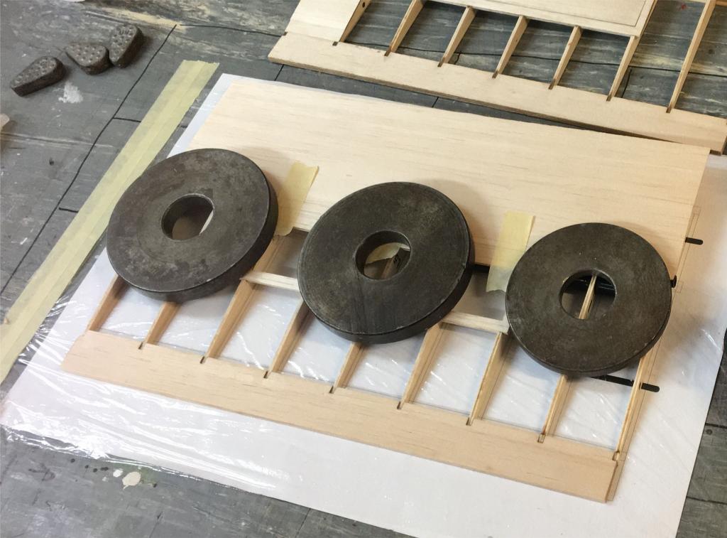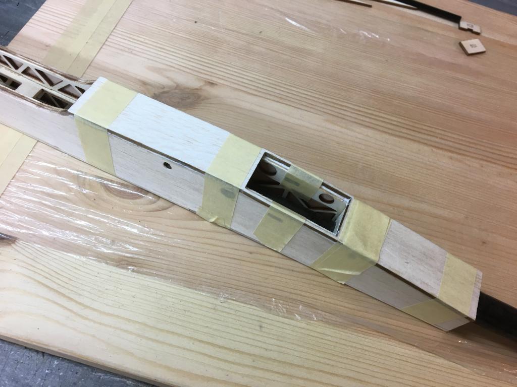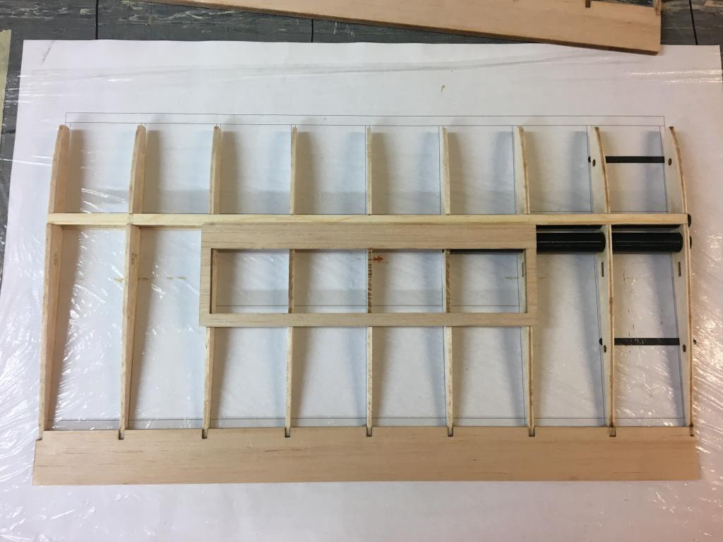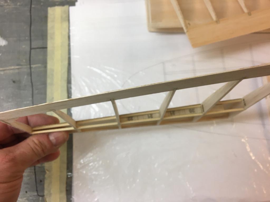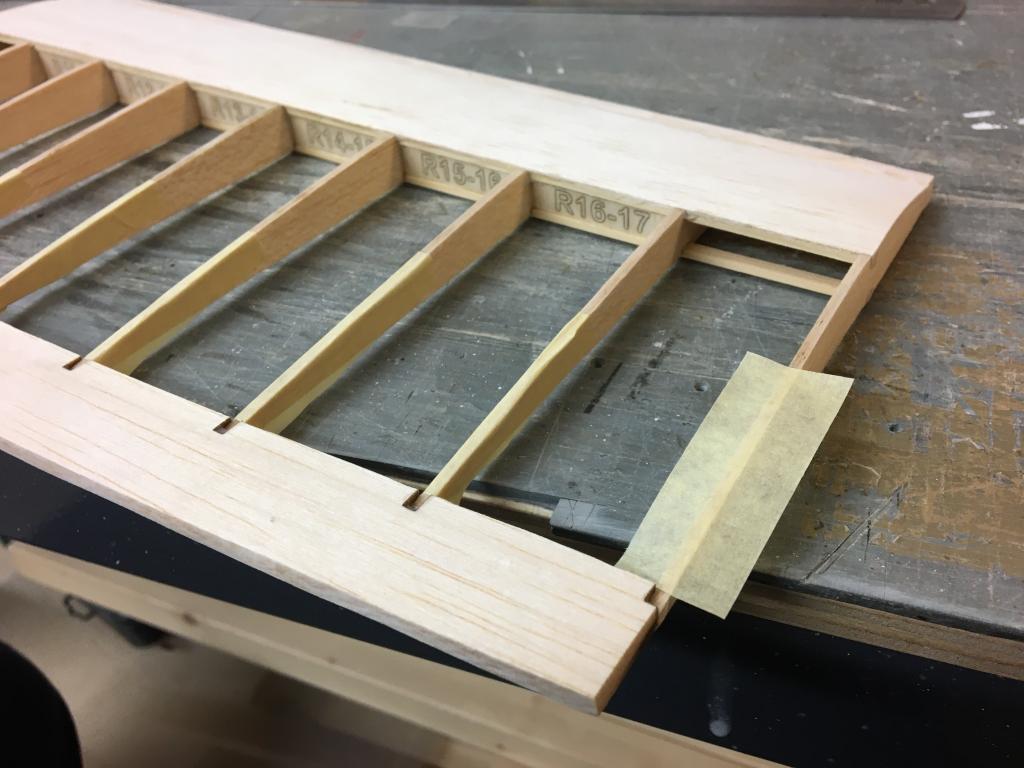 Krídlo je robené klasicky na centroplán dva nosníky 5x2mm + stojiny, D box som navrhol len z vrchnej časti a poťah z hornej a dolnej časti prvé dve rebrá. Stavbu začneme prvým rebrom ku ktorému použijeme prípravok na uhol prvého a posledného rebra kôly vzopätiu /obr.2/. Potom postupne vlepíme stojiny /obr. 3/. Stojiny dávame od 3 po 8 rebro . Potom zalepíme uhlíkovú trubku 8/6 ktorá slúži ako púzdro pre spojku, zatiaľ len o rebrá. Ďalej si zalepíme odtokovku a potom vrchný nosník. Kým zalepíme trubku na závažie, zalepíme 5min epoxidom uhlíkovú trubku 8/6 o horný a spodný nostník , vyplniť . Epoxid trocha zahusťujem. Ďalej si zalepím vrchné spevnenie na brzdový slot /obr.4/ a po ňom D box/obr.5/. Balza na D box má presah tak ju potom treba obrúsiť. Zostáva ešte zalepiť trubku na dovažovanie, nábežnú hranu a spevnenie medzi rebrami R1 a R2 /obr.6/. Nakoniec si prilepíme koreňové rebro rebro /obr. 7/ a máme pripravený centroplán k obrúseniu. Takýmto istým spôsobom lepíme aj ucho 1 a ucho 2 . Medzi rebrami R8 a R9 nie su pri zostavovaní stojiny preto lebo na volné miesta lepíme preglejkovú spojku z uhlom.