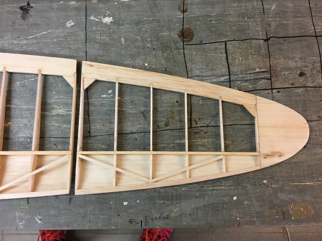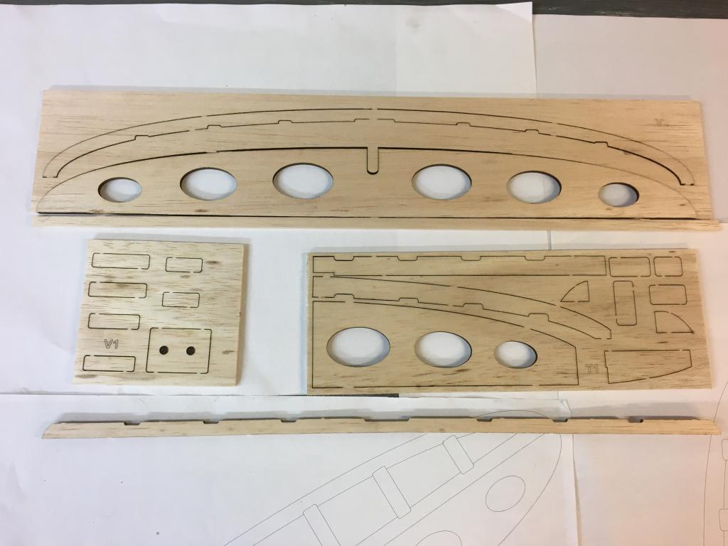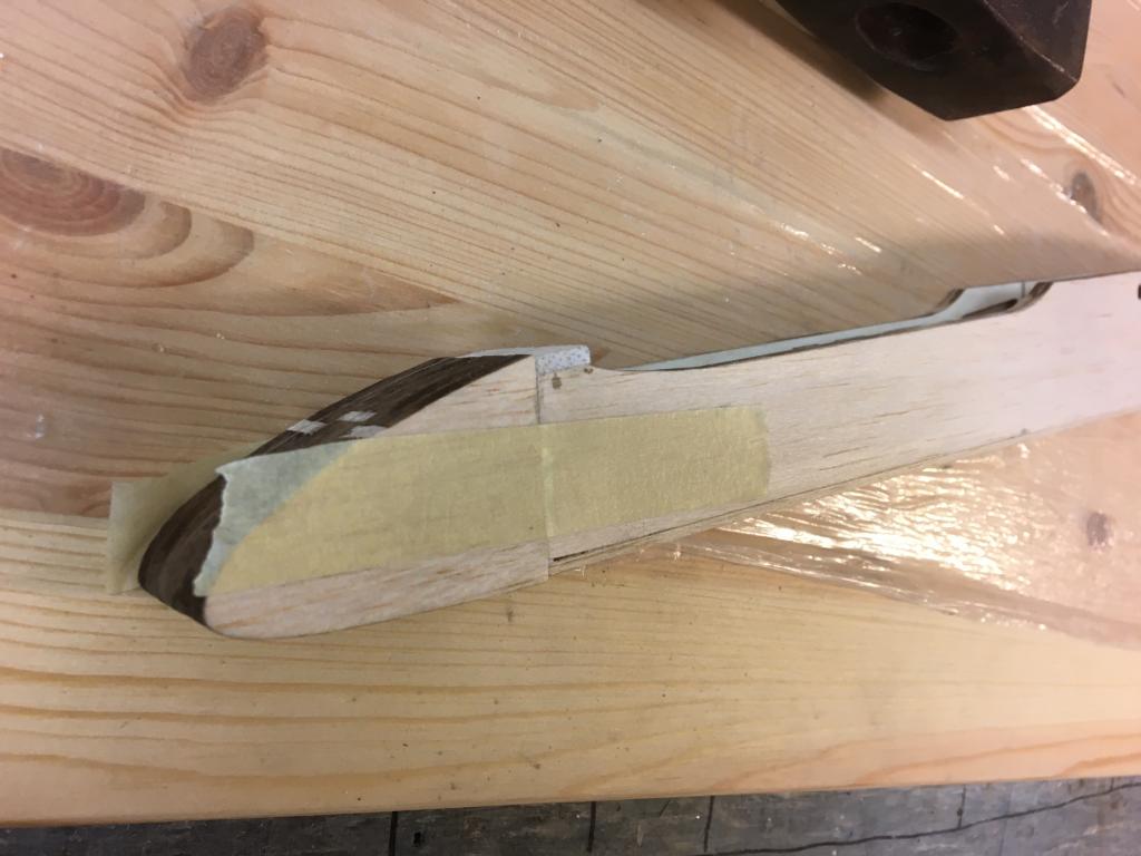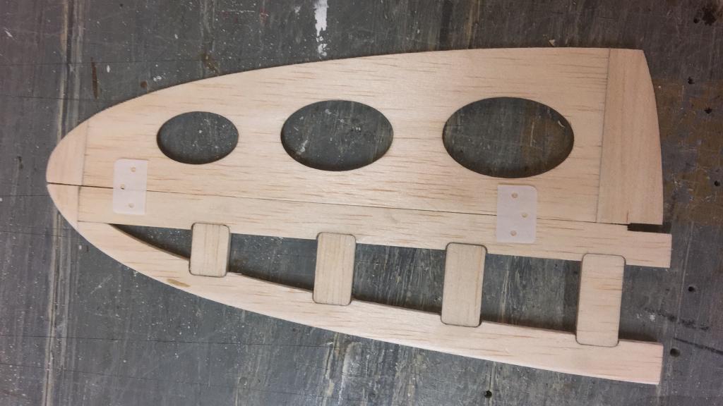 Výškovka smerovka v dnešných stavebniciach a nie len tieto časti sú dnes pred pripravené rezaním na lasery takže stačí trocha prebrúsiť od pálenia naskladať na plán a zlepiť dokopy. Po zlepení obrúsiť kýl, prebrusujem len zvrchu a nábežnú časť do poloblúku.