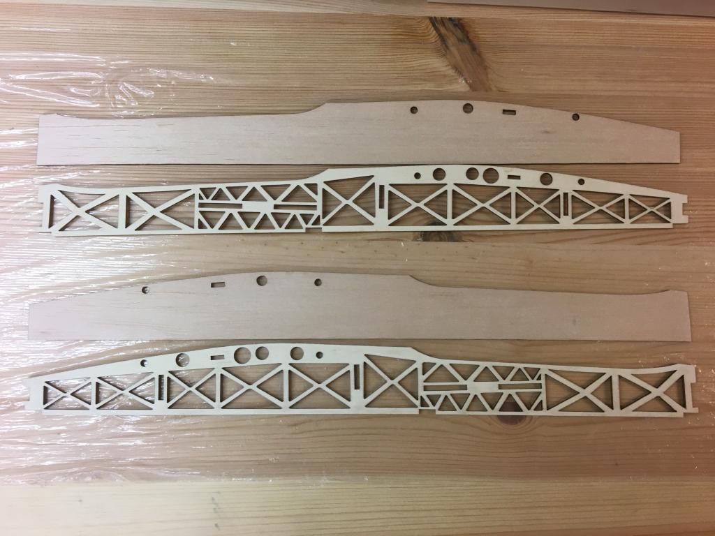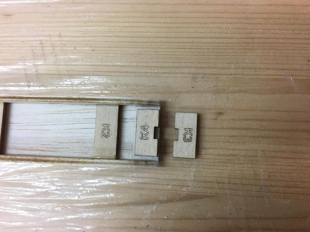 Znova si pripravíme všetky časti podľa /obr. 1/. Bočnice z balzy 2mm a topoľky 3mm /obr.2/ si zlepíme dokopy. Pozor aby sme si zlepili pravú aj ľavú stranu, aby sa nestalo že po zlepení zistíte že máte dve pravé
