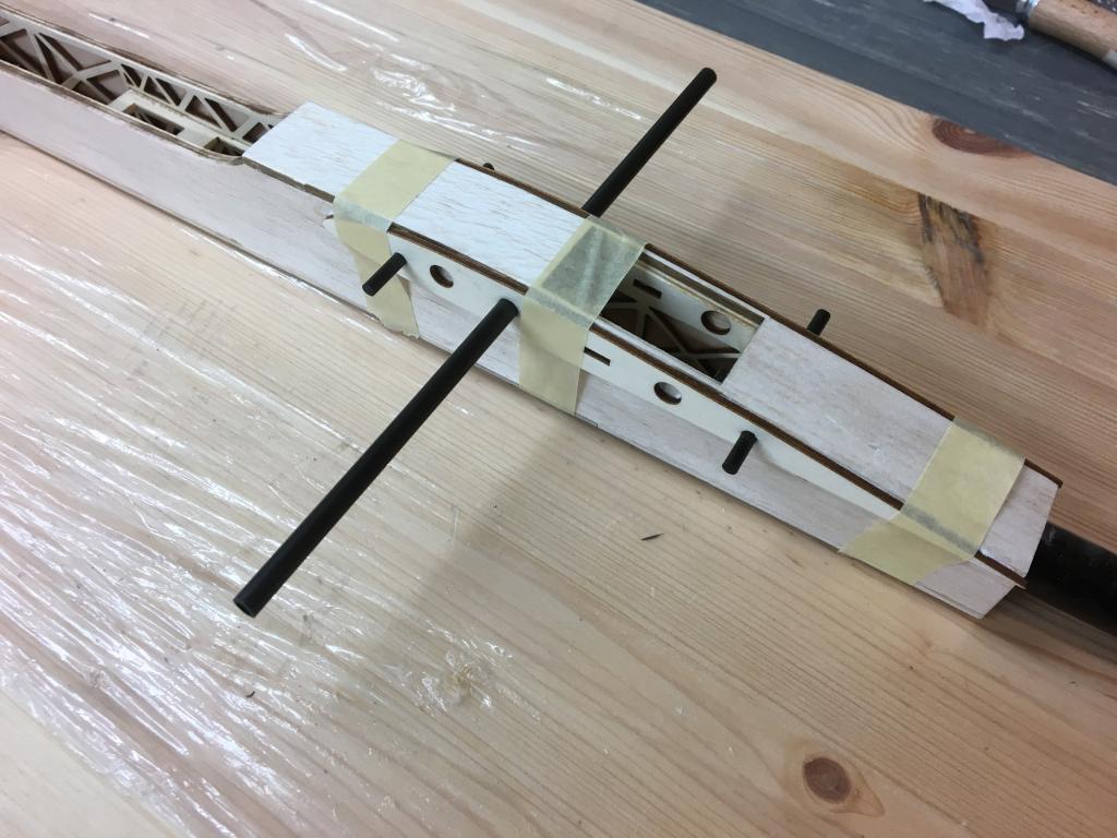 . Keďže to lepím disperzným lepidlom zaťažím si to a nechám vyschnúť až do druhého dňa. Ďalej si prilepím rebro P1 a P2 a spodný diel s topoľky obr. 3/ . Po zaschnutí si navlečiem uhlíkovú trubku na rebro P3 a P4 a zasuniem a prilepím do zámkov . Trubku treba lepiť spolu z gondolou , lebo by ste ju už do trupu nevložili, ale trubku si ešte k rebrám P3 a P4 nelepím / nechám len na voľno/ z dôvodu keď mám poskladané všetky diely a nalepený kozlík, lepšie sa mi licuje krídlo s výškovkou a smerovkou aby som ich mal v rovine, ale aj pekne kolmo smerovka výškovka. . Prilepíme druhú bočnicu a zafixujeme, aby sa zlepilo všetko pekne rovno /obr. 4 a 5/ . Do takto zlepeného trupu zalepíme epoxidom vodiacu trubku 8/6 pre uhlíkovú spojku /obr. 6/. Nalepíme ďalej vrchný poťah z balzy 3mm a spodok 2mm /obr. 7/. Na takto zlepený trup si ešte nalepíme bočné rebrá /obr. 8/ ktoré si zafixujeme uhlíkovou spojkou a vodiacimi spojkami.