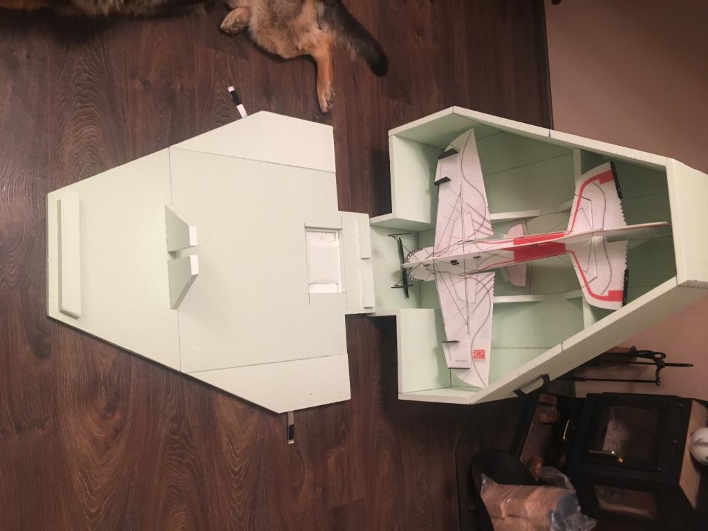 V suché nevytápěné garáži v přepravní bedně z vikuporu - bedna stojí tak, aby model (F3P celouhlík/mylar) stál vrtulemi kolmo k zemi. Bydlely tak postupně všechny moje halovky.
