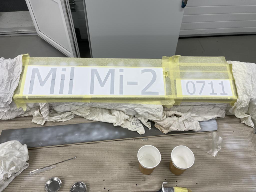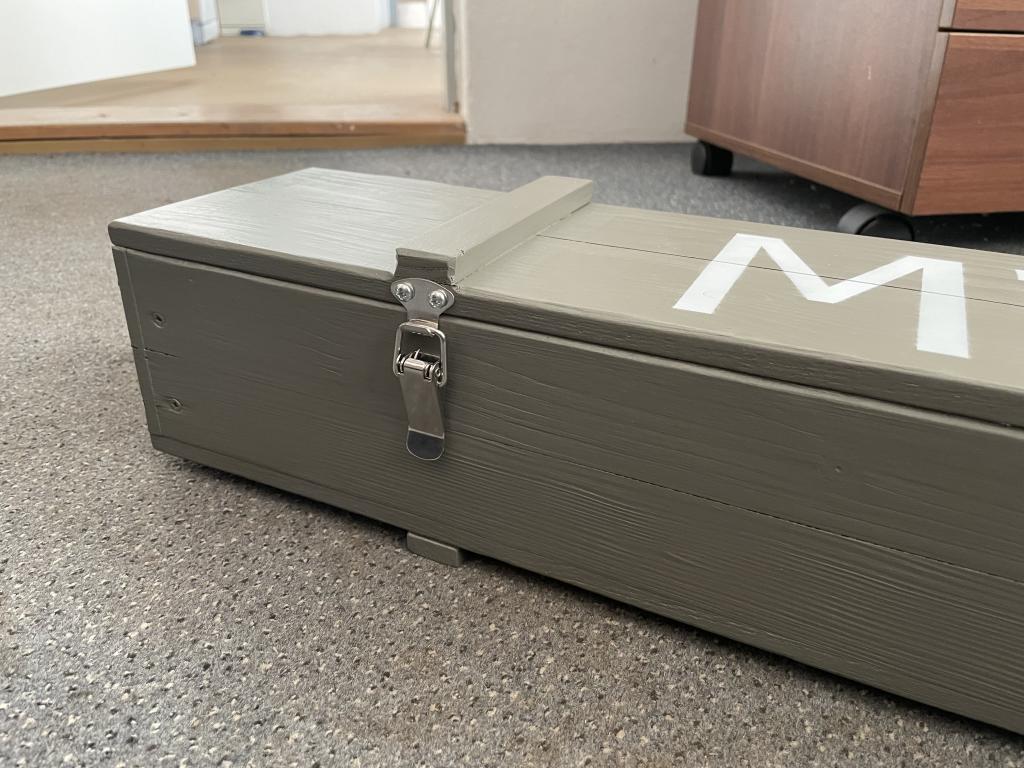 Celou bednu jsem natřel vodou ředitelným duvilaxem RAL 7039, který je použitý na samotném modelu. Minulou neděli jsem pak pomocí airbrush nastříkal bílím duluxem přes nalepenou šablonu nápis MIL MI 2 a k tomu číslo 0711. Bohužel šablona se místy nadzvedla a bílá barva trošku podtekla pod šablonu. Takže jsem během týdne musel miniaturním štětečkem přetírat bílé kapičky.Myslím že se to povedlo.Není nic poznat.Přední zámky jsem objednal z internetu, ale mají je i v unihoby. S dřevařskou prací mi pomohl kamarád, který má doma dřevařskou dílnu a vybavení.
