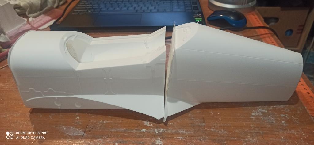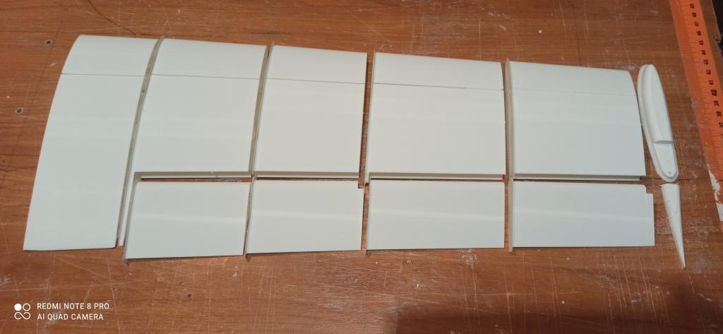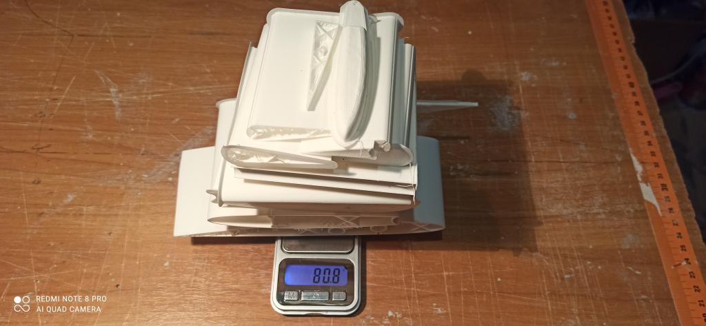 Šlehaný tmel je dobrý nápad, ten neváží skoro nic a není po zatvrdnutí nijak zvlášť křehký. Chci zkusit vytisknout půlku křídla a vytmelit ji, aby se srovnaly ty nerovnosti, co jsem popisoval dřív a pak to celé stříknout plničem, prostě na tom udělat pěkný povrch. Zajímá mě o kolik to ztěžkne.