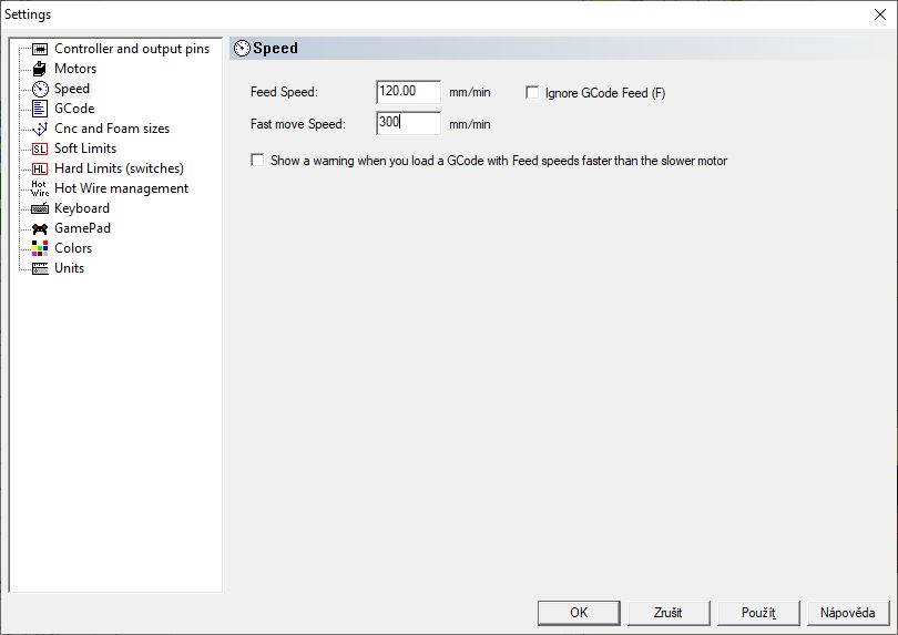 Dále nastavíme maximální rychlost motorů - při velkých rychlostech mohou ztrácet kroky ! takže max 300 a možná i méně