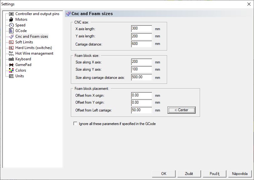 POZOR - program žádným způsobem nemodifikuje GCODE podle zde uvedených rozměrů - slouží to pouze pro vaši kontrolu a vizualizaci procesu řezání - vždy je třeba už v programu DevWingFoam nebo DevFusFoam mít toto správnš zadané a na základě toho budete mít korektně vytvořený GCODE ! ! !
