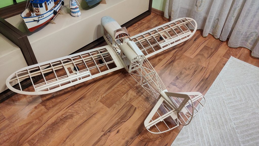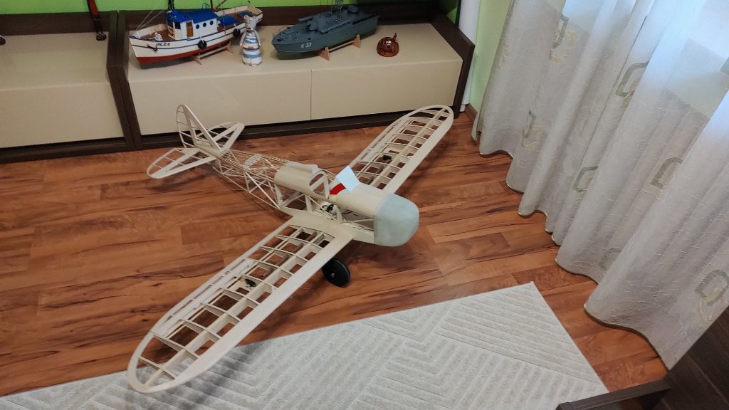 Do trupu se moc nedostanu, mám zrovna v místě křídla dvojité dno a zdola již uzavřeno 0,8mm překližkou. Musím nějaký kolík nebo plocháč vlepit do bočnice trupu a zespodu skrz menší otvor v tuhém potahu křídla nevymyšleným způsobem zajistit, ideálně na "cvak".