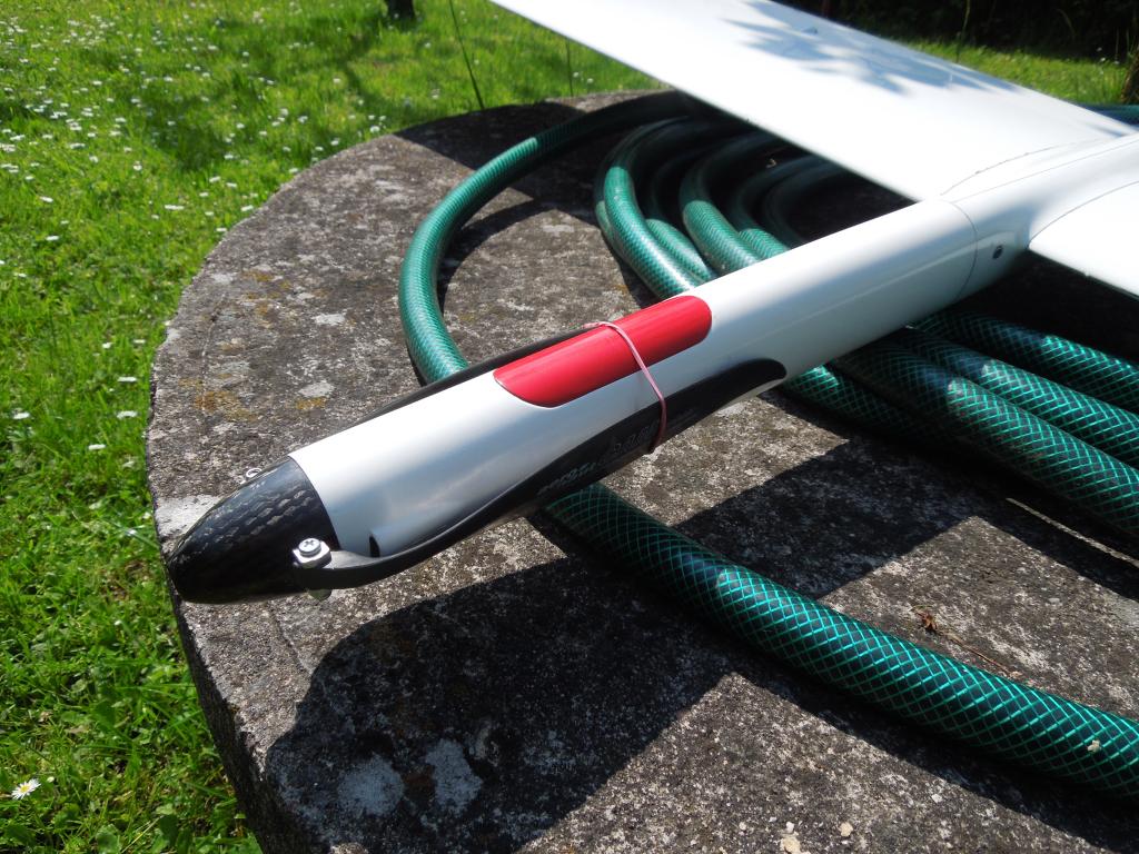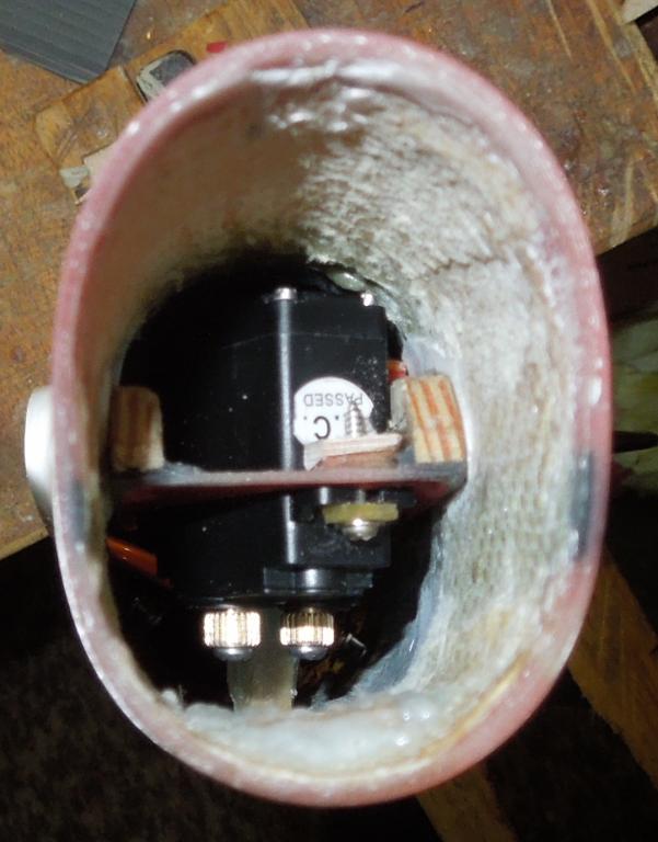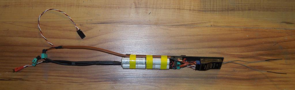 Takže serva jsou po drobné úpravě lože na místě a zkušebně jsem je i s ložem nasunul do trupu a vypadá to OK. Další postup je na desce s baterkama a RX. Kabely ke konektorům jsou už kompletně hotové a připojené k přijímači. No a v trupu je i výfukový otvor, kterým se bude i zapínat baterka pro palubní systém ( MPX konektor ).