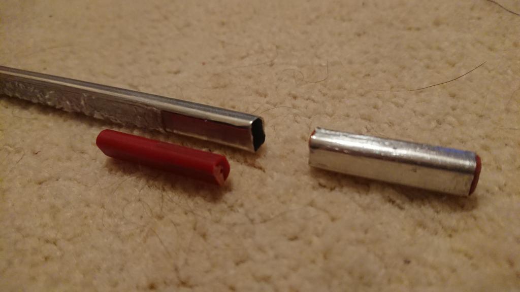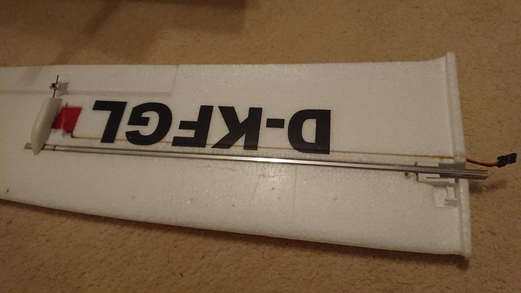 Ten zlomený kousek nosníku jsem nakonec vyřešil jednoduše - řezákem opatrně podél celého nosníku v křídle z obou stran, pak opatrně vyloupnout a otočit. Ten kousek co se ulomil jsem dal na konec křídla pod krytku serva a nosník z druhé strany vyložil dvěma kousky smrkové lišty 3x5mm - vejde se úplně přesně. Původně jsem samozřejmě chtěl dát tu originální červenou tyčku, ale v tom ulomeném kousku se nedařilo to vyndat, bylo to zakápnutý lepidlem.