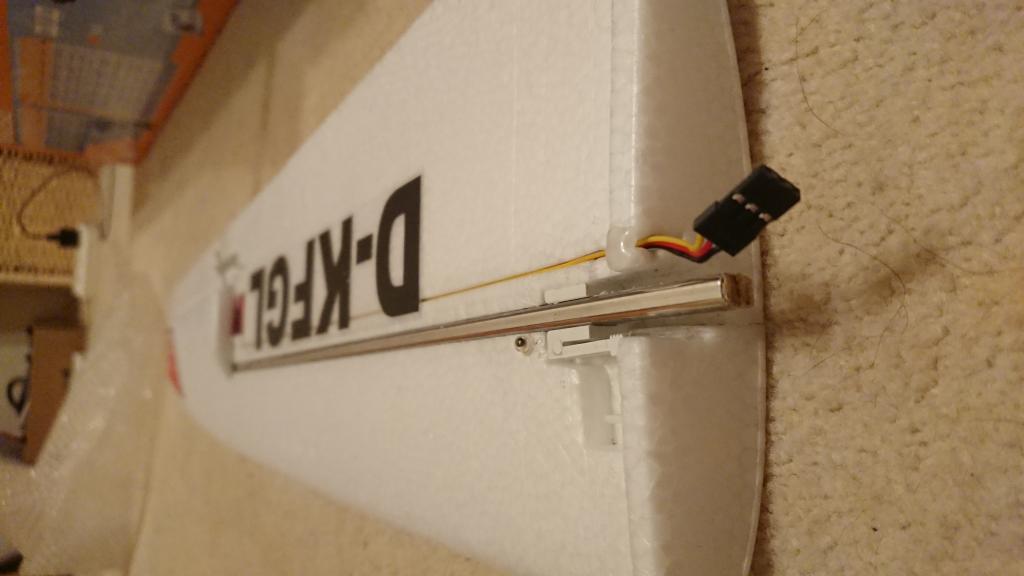 Mé štěstí nebere konce - dnes zálet po opravě. Stačilo trošku dotrimovat výškovku a super. Do té doby než jsem zoufale pozoroval jak Funglider zatleskal a šel k zemi z asi 50 metrů. Naštěstí křídlo zůstalo na kabelu od serva takže letadlo padalo stylem javorového semínka. Poškození nulové - neskutečná odolnost! Ale příčina - zkontrolujte si tu druhou západku s páčkou - ta byla pryč. Ani za hodinu chození po louce jsem to bohužel nenašel. A co jsem koukal tak nejsem sám, asi to Číňan špatně lepí... Teď řeším co s tím - asi to provrtám a půjde tam kolík skrz ten profil...