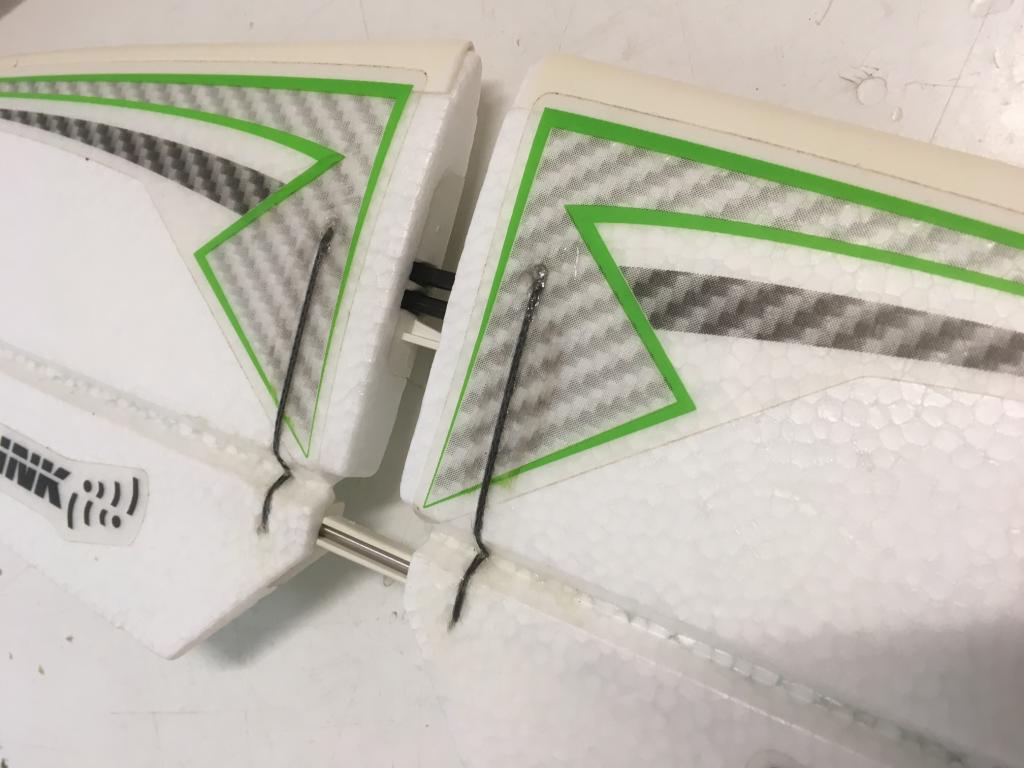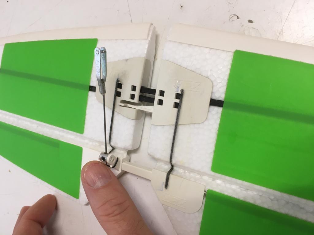 Výškovku mám mírně upravenou, protože jsem někde zaznamenal, že se někomu při vysoké rychlosti utrhla pohyblivá část. Tak jsem to u kořene skrze závěs prošil "do osmičky" kevlarovou nití a zajistil vteřinovkou. Na táhlo jsem dal kovovou nacvakávací vidličku a tak to můžu rychle a jednoduše zapojovat a odpojovat bez nutnosti šroubování a nastavování.
