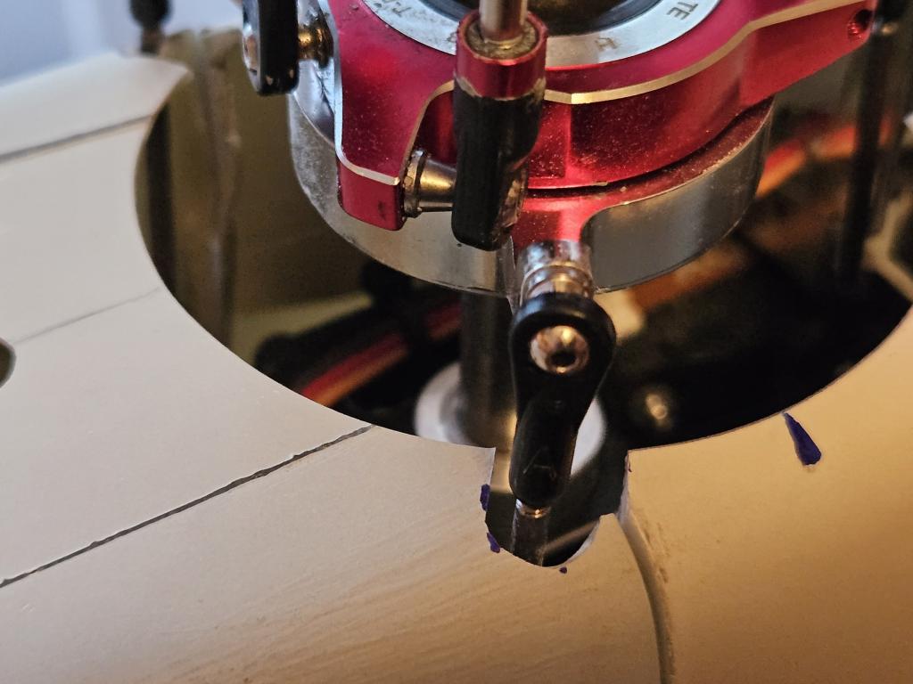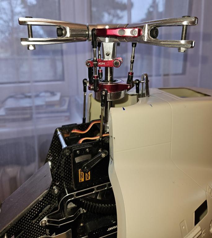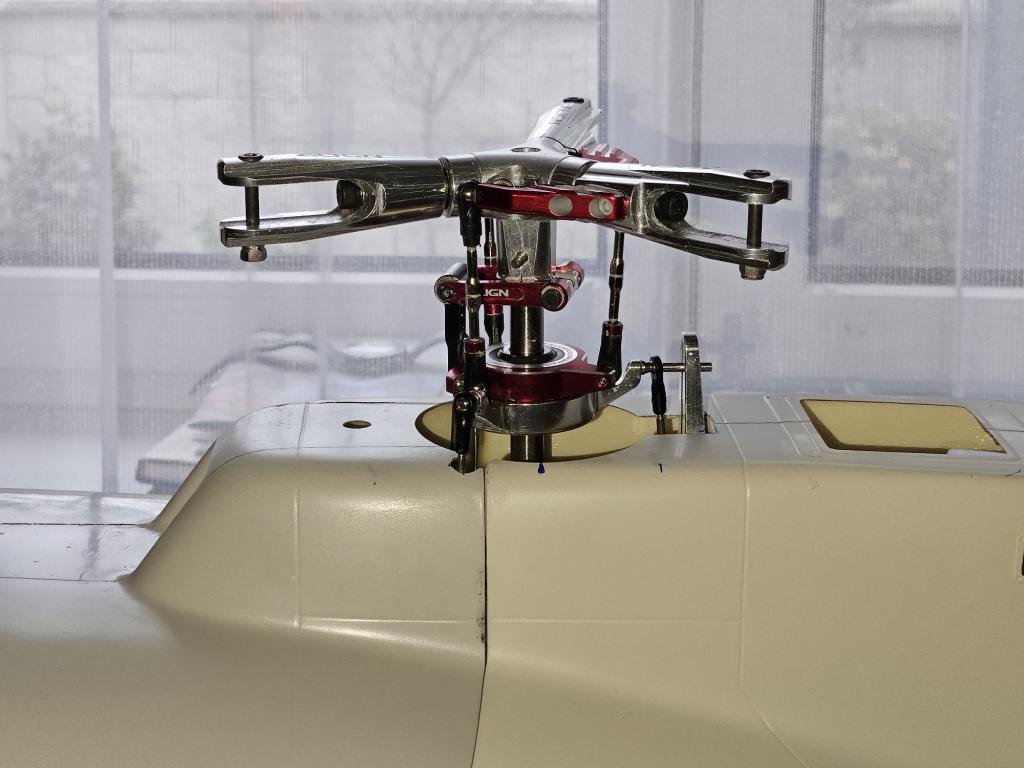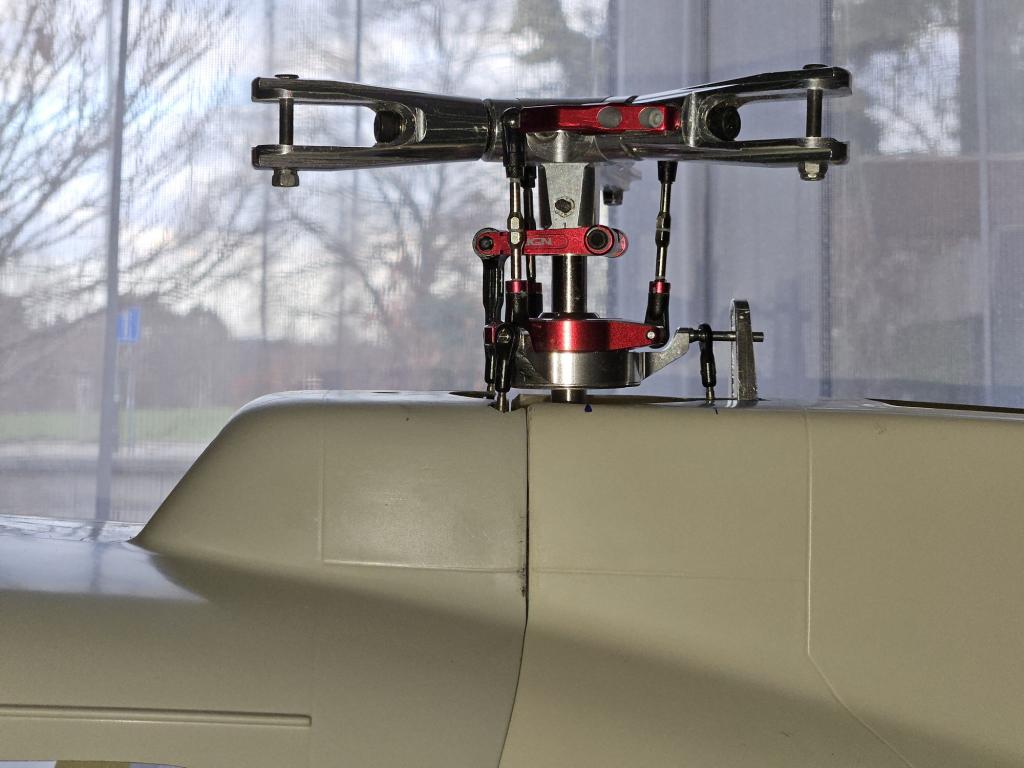 Při porovnání hřídelí mi dnes vyšlo pro tu delší nitrohřídel ( používanou na Hughesech ) o 9mm navíc což mělo bohatě stačit, plánoval jsem prodloužení o cca 10mm. Sestavil jsem to a je vyřešeno, mám poměr 1,85 což je pohoda. Vyfrézoval jsem prostor pro táhla na desku cykliky, prozatím nezbytné minimum. Problém je umístění magnetů v lemu kabiny, tam jsem musel zajet uhlíkovým kotoučkem. Poloha pák serv na fotkách falíruje, snažil jsem se o nulu na gripech abych viděl kde bude základní poloha desky cykliky. Vychází pěkně nad hrbem což byl cíl. V nule to neletí, ve visu a letu bude DC ještě o něco výš což je dobře. Potřebuju vyrobit nová táhla mezi serva a DC, toť vše.