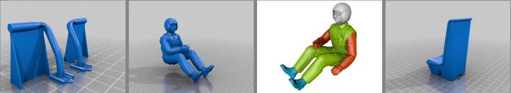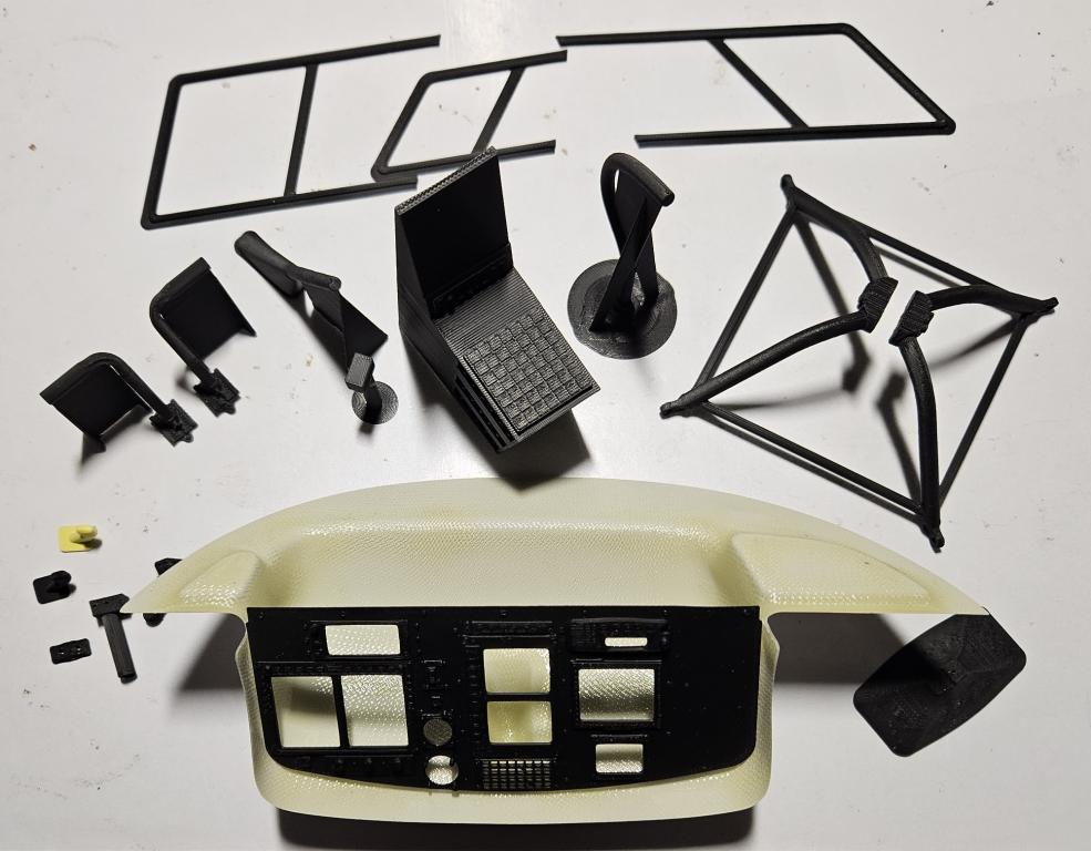Kvůli váze se udělá pilot z lehkého materiálu LW-PLA-HT ze kterého tiskne trup Pavel. Zbytek klasika PLA, asi z černého filamentu. Na stránkách UltiMaker Thingverze je uvedené měřítko 1 : 8 což je v pohodě. Kromě pilota tak vzniknou sedačky, řízení kolektivu, řízení cykliky, spodní část přístrojové části, hlavní přístrojová deska s MFD displeji, posuvné rámečky větraček oken a možná i klec závěsného rámu, po nějaké úpravě by mohla být okolo háku s posuvnou hokejkou včetně závěsných maketových nerezových táhel s vidličkama.