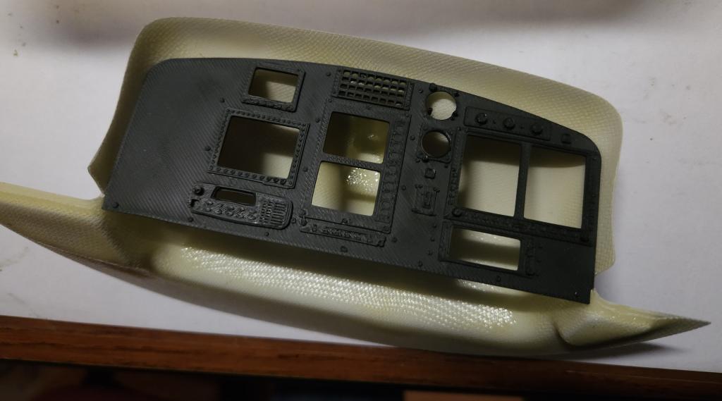 Palubní deska zapadne do laminátového krytu kokpitu dokonale na šířku, linie oblouku nahoře už je špatná a nezbude než improvizovat. Uříznout vršek by znamenalo přijít o jeden budík a nějaké detaily, spíš se bude muset v rozích oblouku nastavit pár milimetrů.