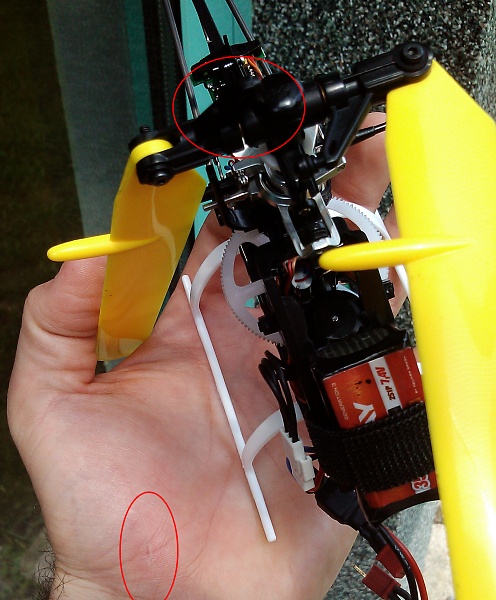 Opět zlomený grip a prasklá hlavní hřídel. Ty táhla mezi hlavou a deskou cykliky jsou moc předimenzované. Už mi 3x praskl grip a ještě ani jednou táhlo. To u mCPX nehrozilo,