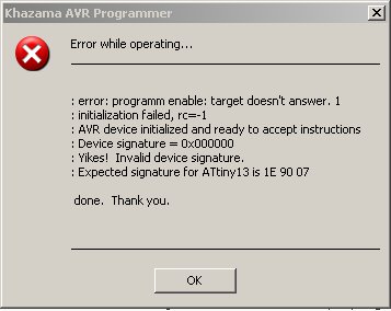 Dnes mi přišel ten programátor, svítí žlutě, po zapojení chipu a spuštění programu se nic neděje HEX nejde zapsat do chipu. Není třeba do attiny nahrát boottloader.