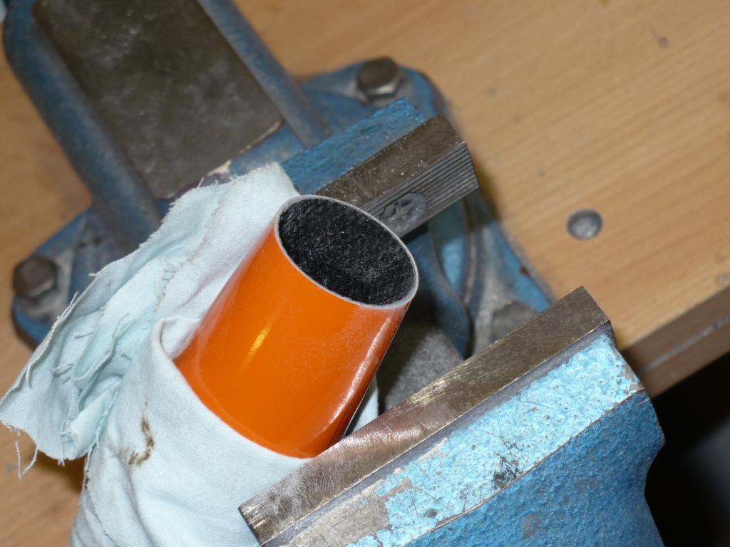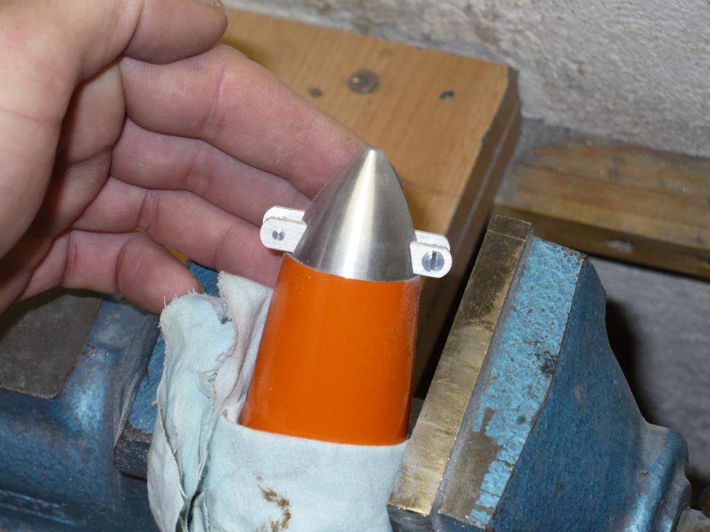 Abych Dzordzika trošku namlsal. :-) Trup u Dinga je (jak je běžné) ve špici oválný. Ale dá se tam dost přesně napasovat kulatá přepážka. Pro správné dobroušení na přesno mám (možná známý fígl). Trup uříznu dál od zamýšlené přepážky a zmáčknu ve svěráku. A to tak až je otvor kulatý. A pak si v klidu prousím až na přesný průměr kuželu vrtule.