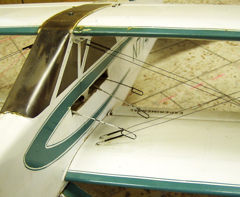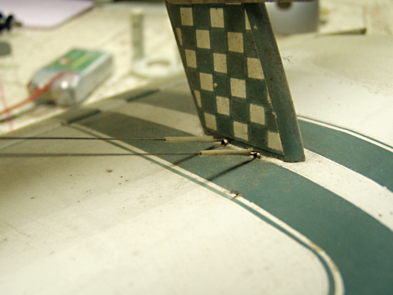 Konce, na délku zkrácené struny , jsou naohýbané do protivky a po navlečení na kotevní oka v křídle jsou proti rozevření a sesmeknutí pojištěné převlečenou bužírkou ( izolace stažena z meděného drátku).