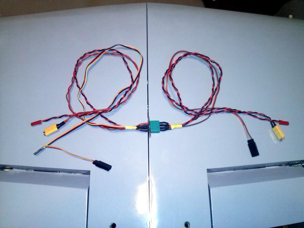 Levé křídlo má také téměř vše osazené a propojené. To co trčí nezapojené je prodlužovák k podvozku a přívod od balančního kabelu aku (napájení zvukovky). Ještě tam přijde rozdvojka pro servosignál do reglu.