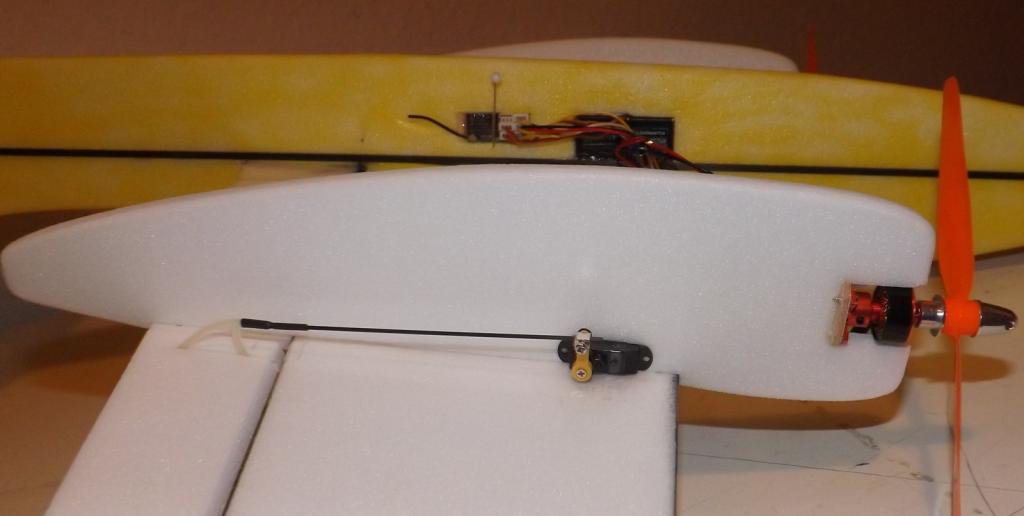 Ona ta žlutá na bílé kryje přece jen lépe (než modrá) a méně fouknutá místa tolik nesvítí. Důležité je že to váhově už moc nenabylo. Hmotí to 114g se "suchou nádrží", včetně zmínených GensAce vyjde pak letovka 148g, což se mi docela líbí. Díky tomu že jsem cpal vše pokud možno dopředu, vychází těžiště docela slušně, baterkou to již jen mírně doladím.