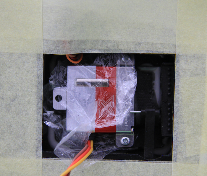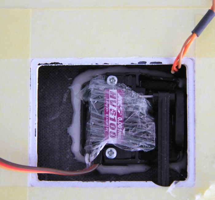 Zlepeny ramecek kridelka, vcetne serva. Servo je zatim ve folii (ktera zabrani prilepeni serva k potahu)