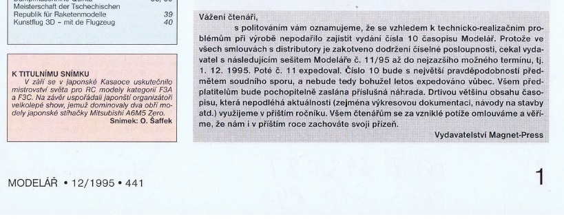 Časopis Modelář 10/1995 celkom zrejme nevyšiel. V čísle 12/1995 je o tom malá zmienka, pozri prílohu