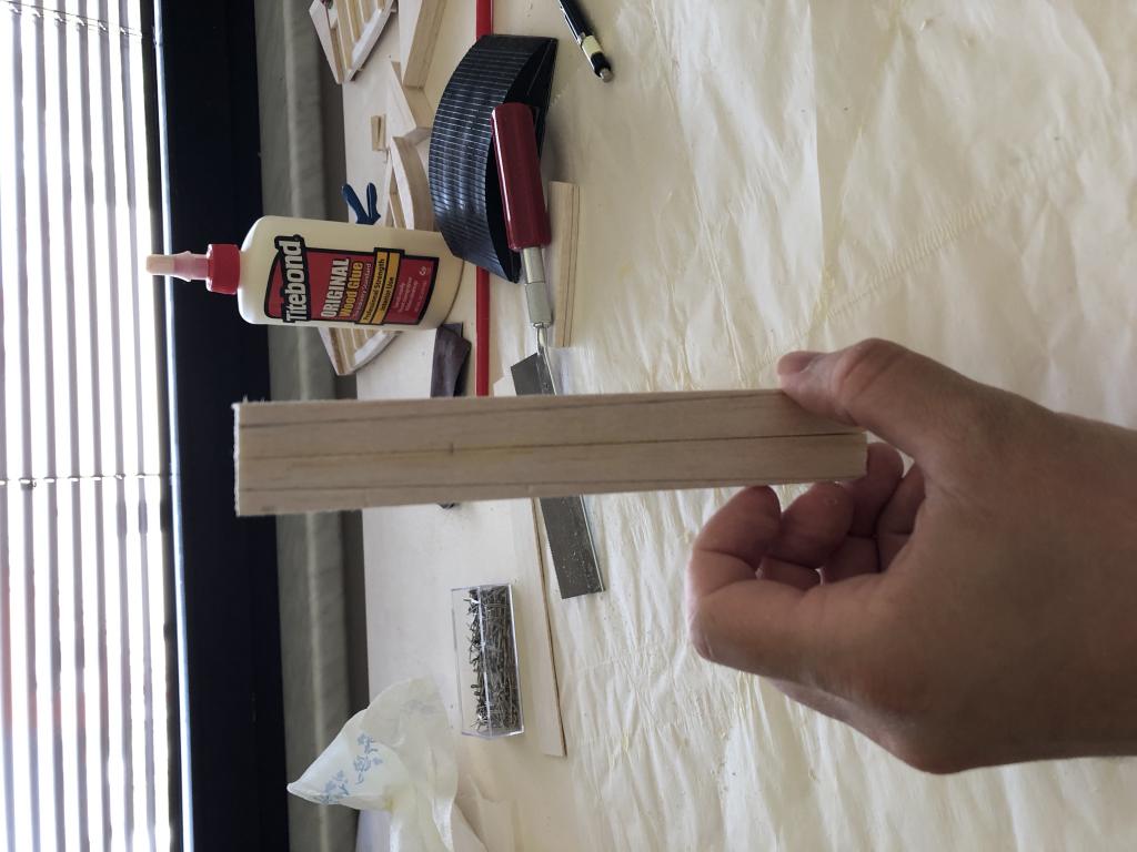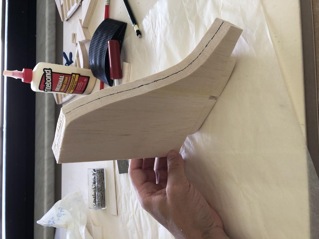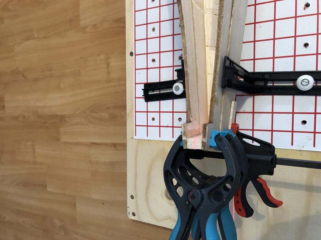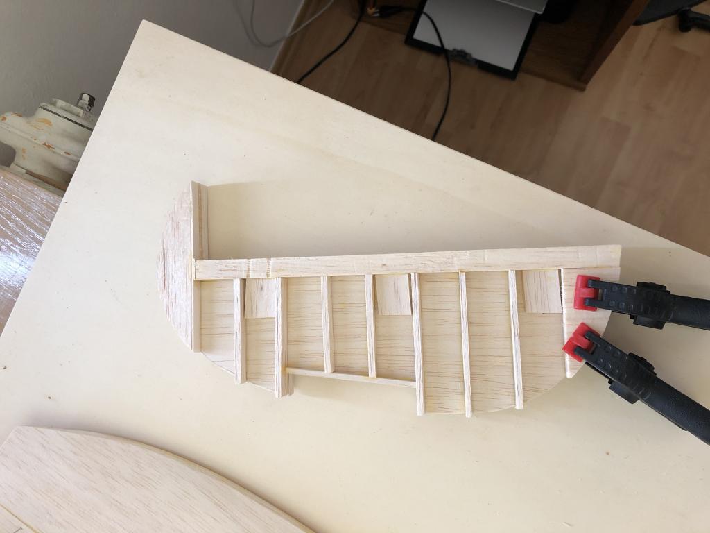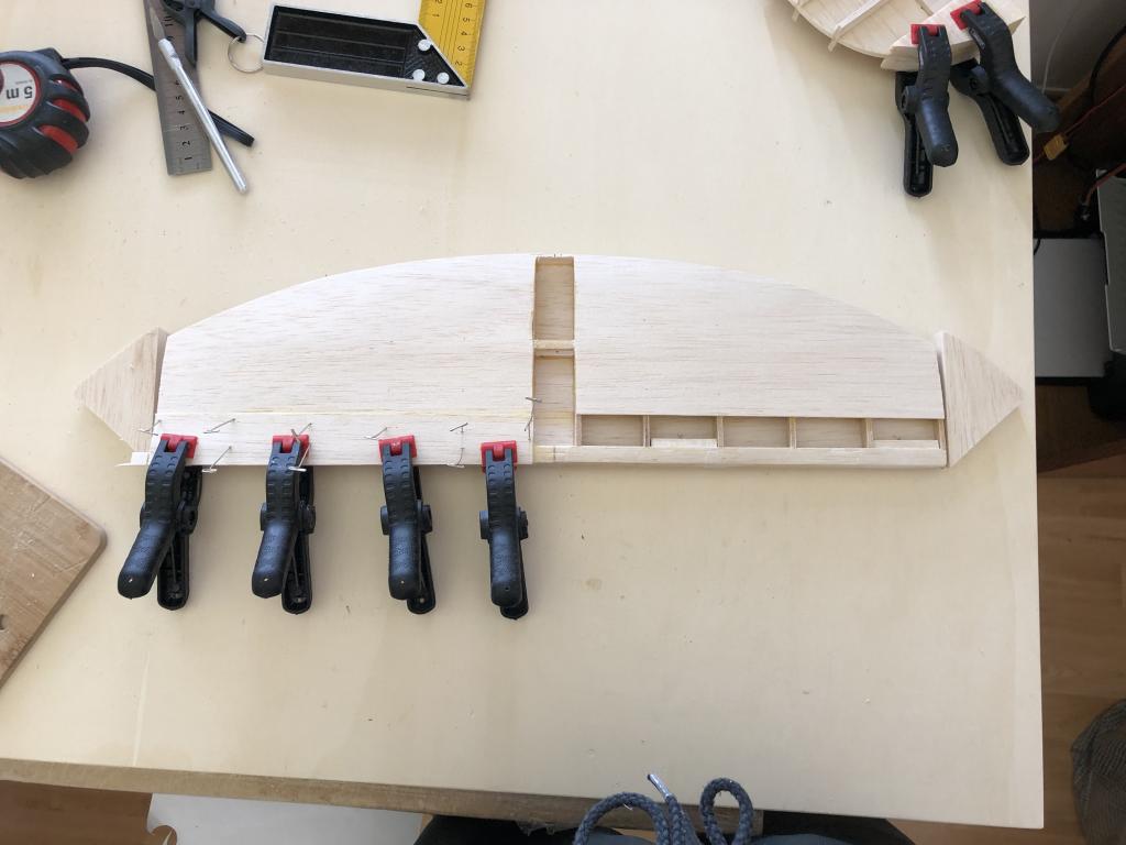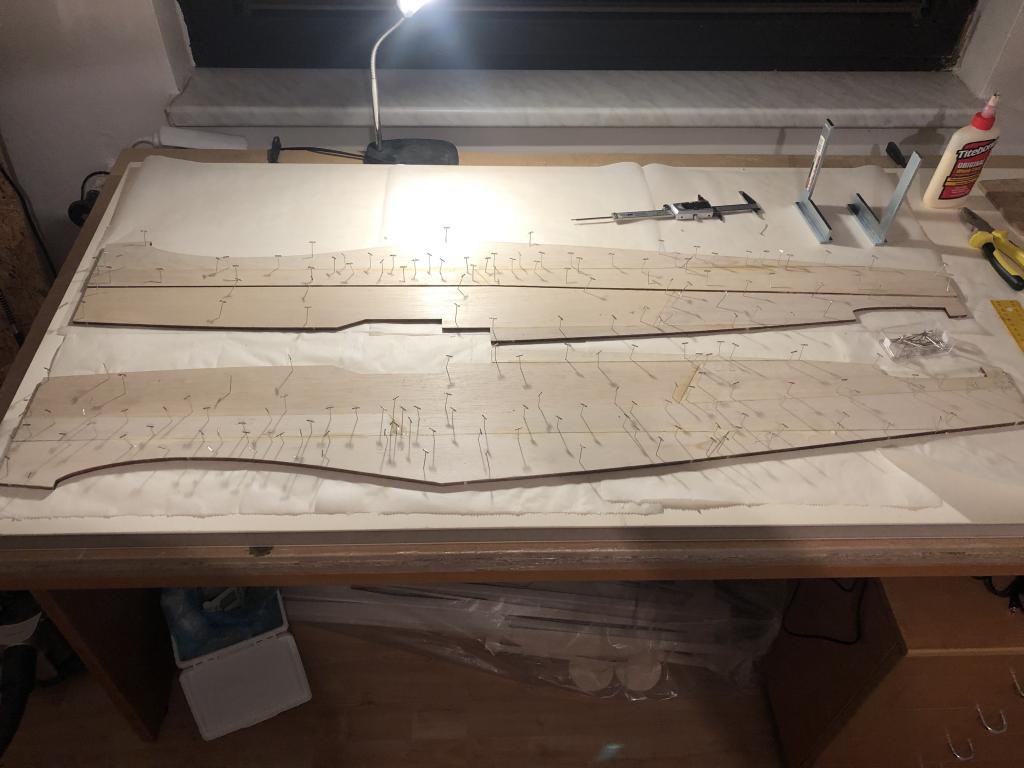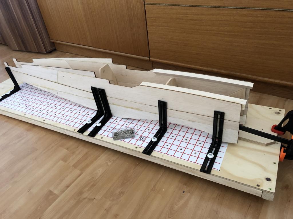 Začal jsem práce na trupu. Šlo to poměrně hezky. Díly bočnic jsou různých šířek, s tím, že hladká strana je logicky ta vnitřní a nerovná vnější, ale ta se stejně bude brousit.Díly jsem zafixoval všemi špendlíky a nechal přes noc zaschnout.