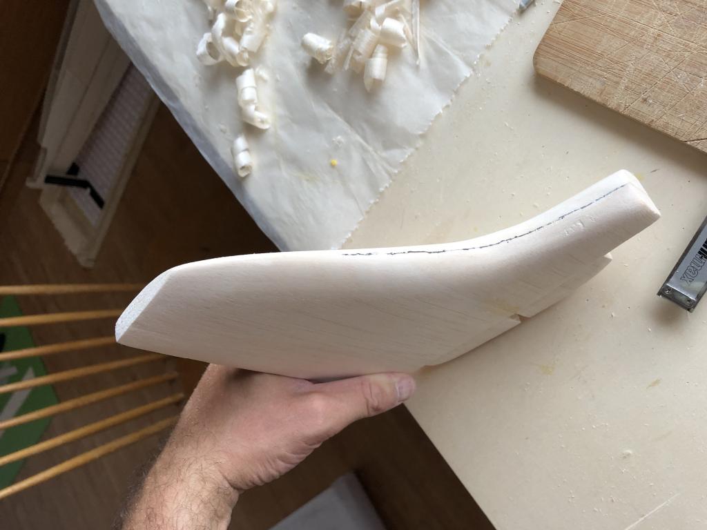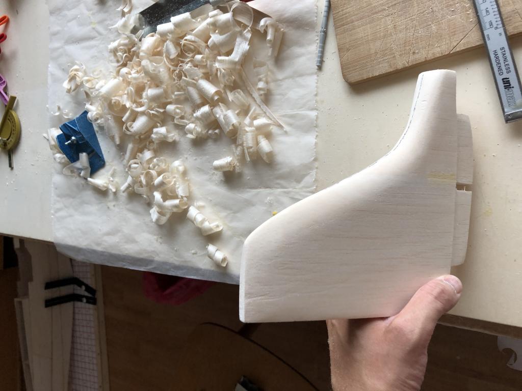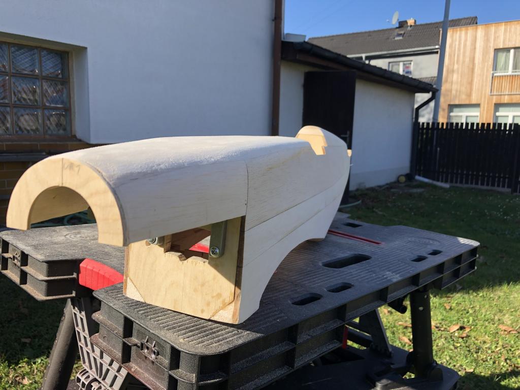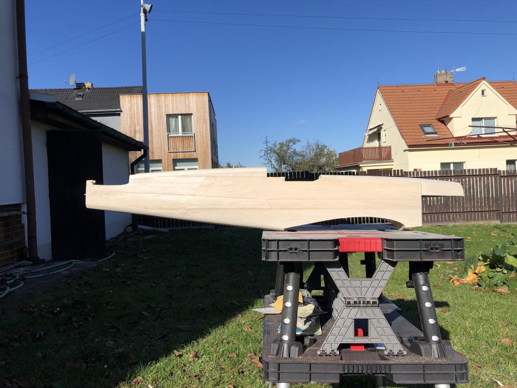 Už jsem to jednou říkal, ale fakt si neužívám broušení. Bojím se, že výsledný tvar pokazím. Na druhou stranu, když to vyjde a výsledek dobrousím 800 papírem tak si ten moment vychutnávám. Přesně tak to bylo v tomto případě. Broušení trupu jsem odkládal co to šlo, ale už jsem neměl co jiného dělat, tak jsem se do toho pustil. Nejdřív jsem trup nahrubo opracoval hoblíkem. Druhý den jsem to dobrousil venku. Hodně se mi to líbí.