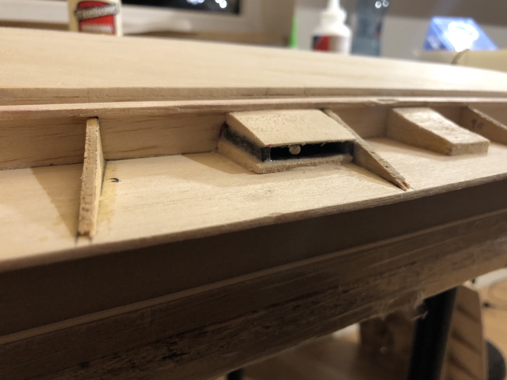 Druhý den jsem se dal do podélných trojuhelníků a přepážek. Přepážka 3 je kolmá, ale 4 je pod mírným úhlem nakloňena, tak jsem vyrobil ze zbytku balzy podpěru a tím přepážku zafixoval do zaschnutí. Po zhruba dvou hodinách jsem přilepil i druhou bočnici.